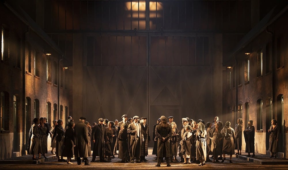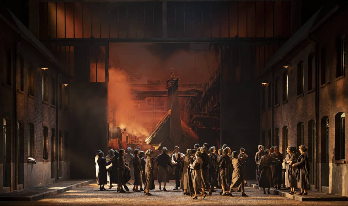 Après un prélude permettant à la vidéographie du très talentueux Paulo Correia – quasi omni-présente dans ce spectacle – de plonger le spectateur dans l’enfer du déluge de feu et de boue des lieux des combats de la Première Guerre mondiale, le rideau se lève sur un impressionnant décor, signé Jean-Pierre Laporte, reproduisant en fond de scène une usine et ses machines modernes et, au premier plan, une perspective de corons aux briques sombres, tels que l’on pouvait en trouver dans les grandes villes minières d’Europe : du plus bel effet scénique, ce qu’il nous paraît indispensable de souligner à une époque où l’importance du décor d’opéra est souvent reléguée au second plan !