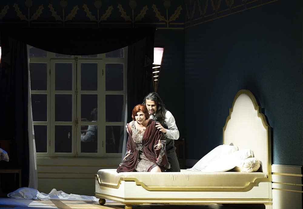 Monter Macbeth en 2022 nécessite de disposer de voix solides et endurantes – sans être nécessairement de grands noms de l’art lyrique international – totalement engagées dans le projet scénique : c’est ce que propose l’affiche réunie par Bertrand Rossi. Ainsi, on a pu entendre des Macbeth au volume vocal plus imposant que Dalibor Jenis, baryton à l’organe changeant de couleur selon les moments de la soirée… Mais, une fois que l’on s’est (re)dit que l’ère des Bruson, Cappuccilli et autres Nucci est définitivement (?) close – mais qui le saura encore parmi les nouveaux publics de l’art lyrique ? – on se doit de reconnaître que la ligne de chant est nuancée et que la voix du baryton slovaque sait parfaitement se projeter dans le vaisseau niçois : cela nous permet d’entendre un « Pietà, rispetto, amore » au legato rigoureux, sans effets outrecuidants.