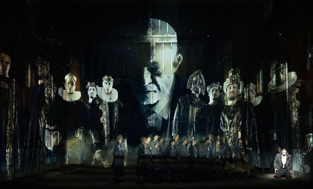 Si le fantastique et le côté lugubre, autres passages obligés de l’ouvrage, sont loin d’être absents de cette production, avec en particulier une présence régulière de la pluie et une belle palette de couleurs entre le noir, le gris et le bordeaux, on le doit de nouveau au mapping vidéo nous permettant, enfin, par de magnifiques projections de style troubadour – les influences de la série Game of Thrones ! – de voir défiler la lignée de Banquo, dans la scène des apparitions, sans pouffer de rire !