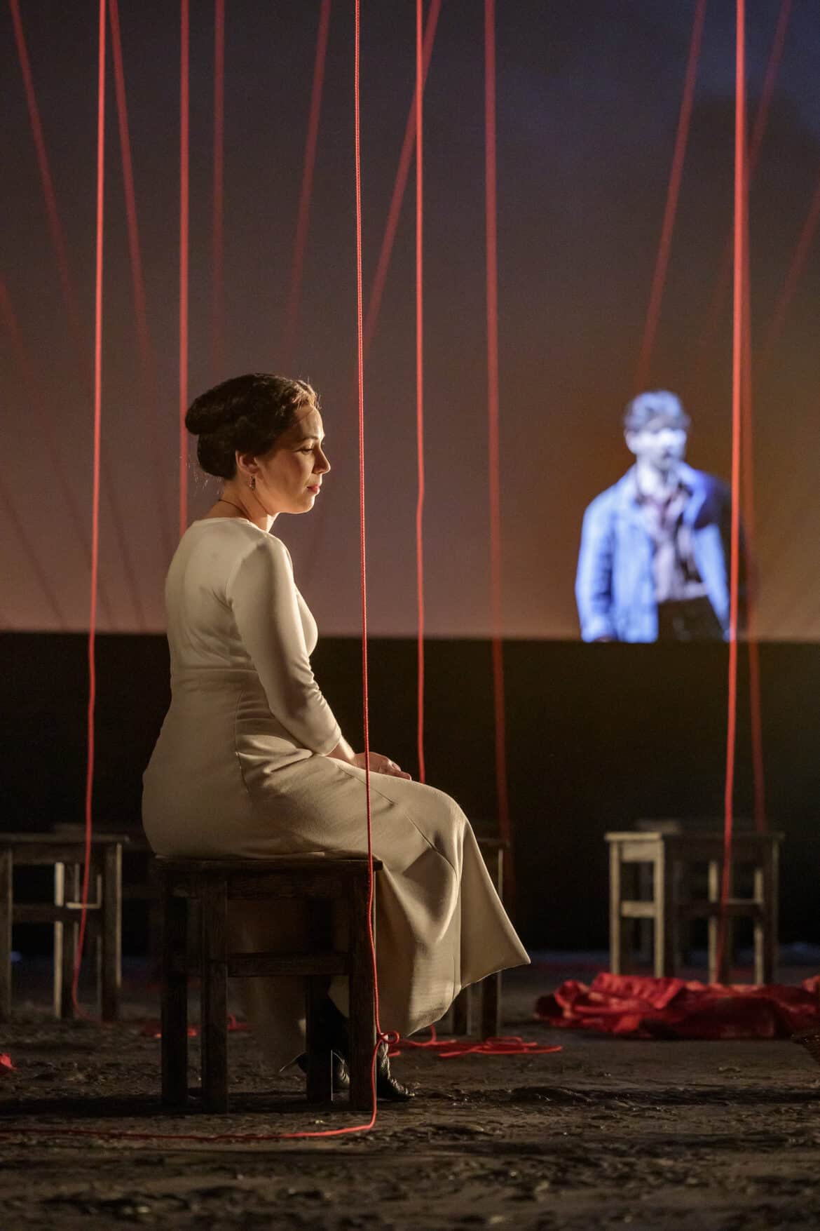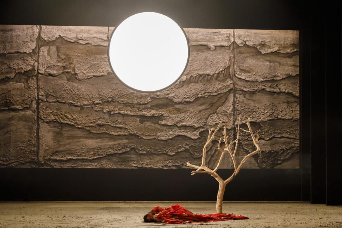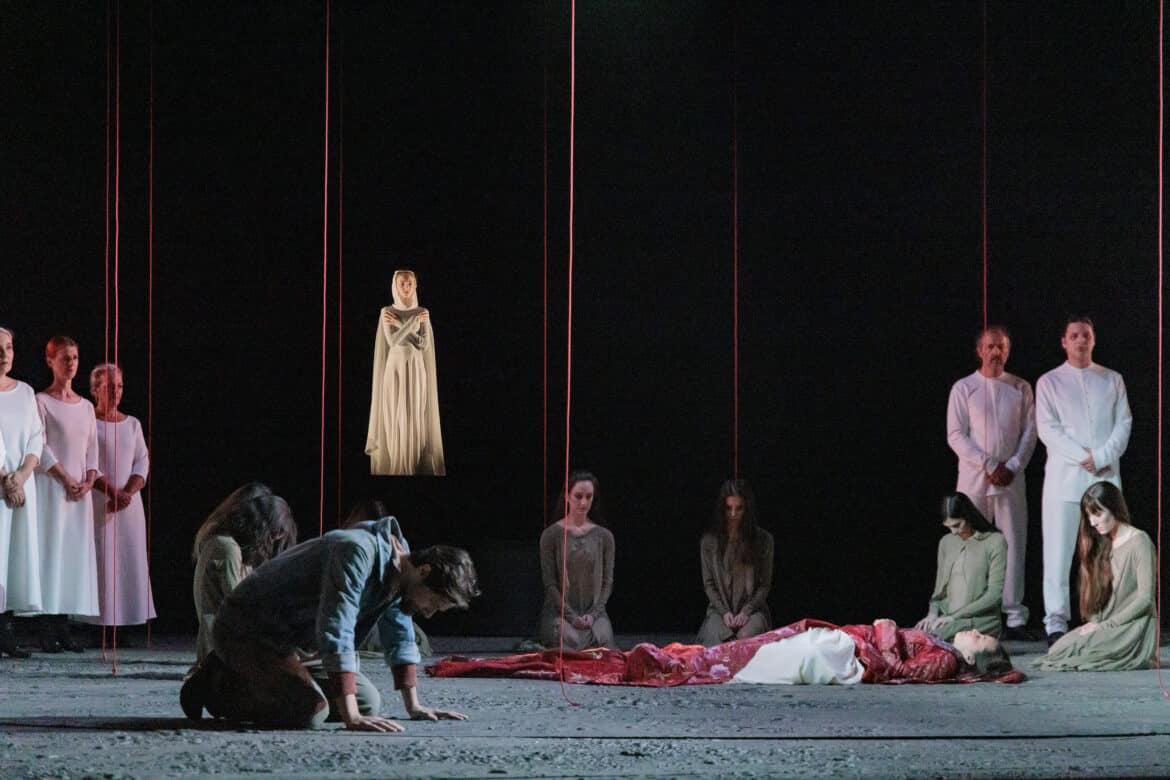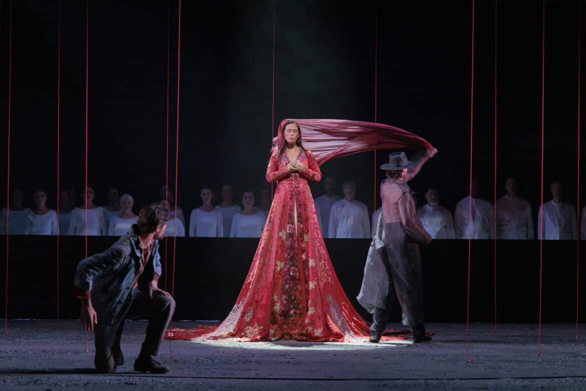 À l’exception de la scène des Arènes d’Arles, qui donne à voir un tableau vivement coloré avec Arlésiennes et Arlésiens en costumes et une farandole joyeuse, bigarrée et pleine d’entrain, la mise en scène de Paul-Émile Fourny joue plutôt la carte de la sobriété, de la stylisation et du symbole, avec quelques idées bienvenues : la solution trouvée pour la scène du Val d’Enfer et celle de l’engloutissement d’Ourrias, toujours assez difficiles à réaliser, est à la fois efficace et poétique, comme l’est la présence récurrente de ces longs fils rouges verticaux. Représentant au premier tableau les fils tissés par les « magnanarelles » (occupées à confectionner la magnifique robe rouge que portera, au tableau final, une Mireille érigée en Madone au moment de sa mort [1]), ils symbolisent également les fils des Parques, représentant le destin des personnages et singulièrement celui de l’héroïne, brutalement brisé par l’égoïsme de son père. Une référence à l’Antiquité pas si éloignée de Mistral lorsqu’on sait que le poète provençal a conçu son œuvre comme un poème épique divisé en douze chants…
