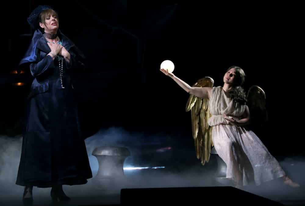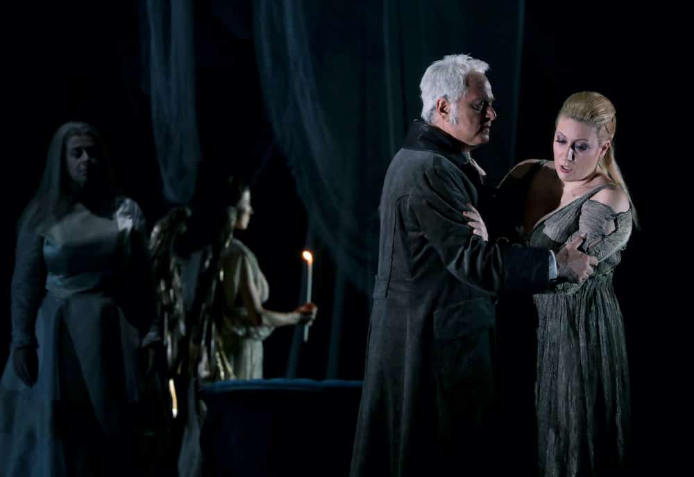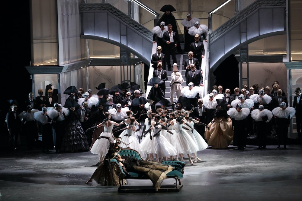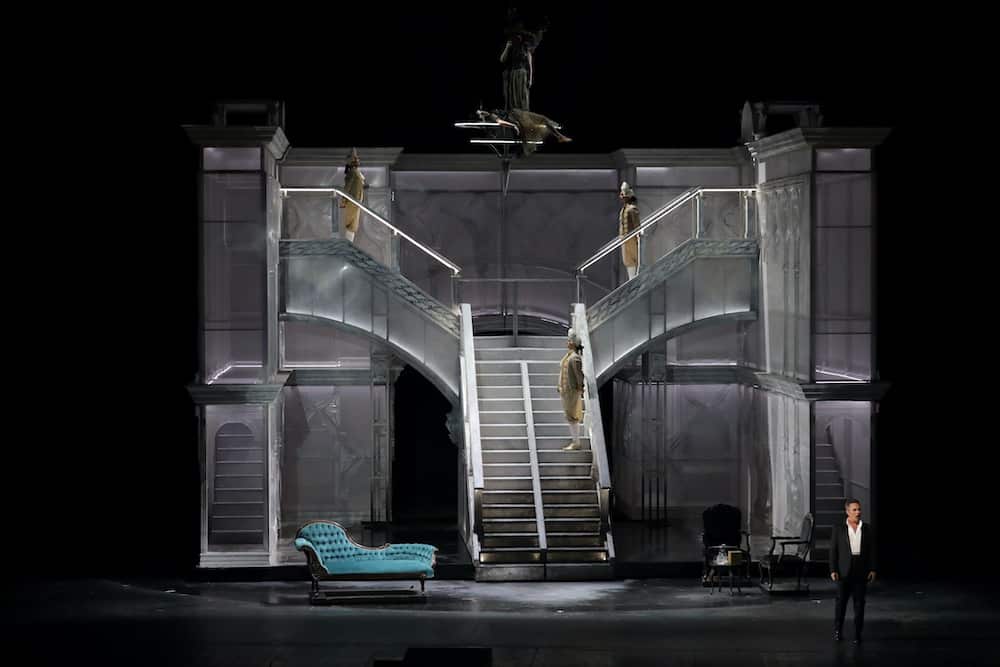 Le réalisateur turinois recrée une Venise lugubre et onirique, entre la Venise Céleste de Mœbius et le Casanova de Fellini, avec les ponts, escaliers et palais transparents dessinés par Giò Forma – même si le brigantin du deuxième acte est beaucoup trop réaliste. La scène est hantée par les cruels « Pulcinelli » tels que Tiepolo les représente à la Ca’ Rezzonico : ce sont ici des bouffons au service du chef de l’inquisition, anges de la mort et génies maléfiques descendus du ciel. Gondoles lugubres, chapiteaux suspendus, fenêtres à meneaux et colonnades évoquent la cité lagunaire. Le côté hyper-technologique auquel Livermore nous a habitués se limite ici aux projections conçues par D-Wok, seulement décoratives, avec des contours d’églises dans la brume montant de la mer, des plafonds à caissons de palais grandioses et une figure féminine flottant dans l’eau, faisant peut-être allusion à la mère aveugle noyée dans le canal. Le jeu des chanteurs nous a paru également moins soigné que d’habitude…