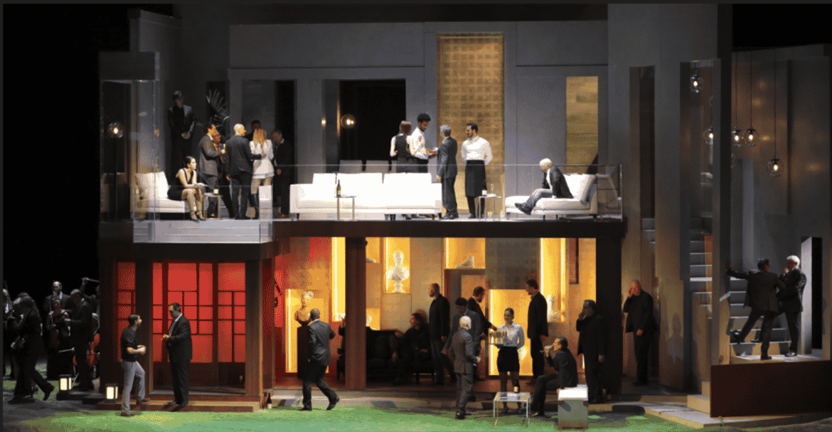 C’est Mario Martone qui signe la mise en scène, laquelle prend appui sur un découpage quasi cinématographique, très moderne, permettant de clairement différencier l’univers brillant et luxueux du duc, un monde où les nouveaux riches et les jeunes entrepreneurs organisent des fêtes au cours desquelles on drogue les filles afin de les transformer en poupées sexuelles (difficile, pour un spectateur milanais, de ne pas voir ici une allusion à l’affaire de la « Terrazza sentimento », lieu milanais où étaient jusqu’à il n’y a guère organisées des fêtes privées et où eurent lieu divers scandales sexuels ayant impliqué son propriétaire), et le monde du petit peuple, caractérisé par la pauvreté et la misère, auquel appartient Rigoletto. Pour rendre cette opposition visible, Mario Martone utilise une structure tournante à deux visages mais qui, in fine, semblent révéler une unique et triste condition humaine, dominée par la misère de sentiments crus, égoïstes, serviles, chacun étant assujetti à / corrompu par un seul Dieu : l’Argent.