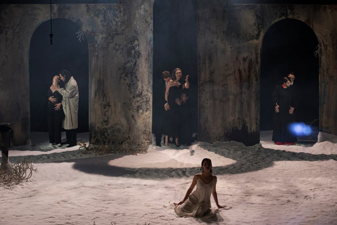 La mise en scène, signée Victoria Sitjà, a été pensée comme un hommage à Pina Bausch. De fait, le plateau de l’amphithéâtre Messiaen recouvert de terre rappelle celui sur lequel évoluaient les danseurs du Sacre du printemps ; la démarche lente et hésitante de Marine Chagnon, qui ouvre le spectacle en interprétant la mort de Didon de Purcell est une quasi citation de Cafe Müller, et les gestes chorégraphiés[1] des chanteurs (notamment les longues et belles arabesques dessinées par les bras…) paraissent comme autant de souvenirs de l’art de la chorégraphe allemande. Mais au-delà de l’hommage, c’est la capacité à relier entre elles des pièces disparates et à les faire se succéder de façon fluide que l’on apprécie : toute narration est évitée (du reste, une narration était-elle possible à partir de supports littéraires et musicaux aussi disparates ?), et c’est plus à un succession d’ambiances que le spectateur est confronté, des ambiances tour à tour oniriques, érotiques, humoristiques, désespérées… On est pleinement séduit lorsque l’aspect visuel du spectacle laisse respirer et vivre la musique et prolonge l’émotion que celle-ci suscitée (le Morgen de Strauss) ; on l’est parfois moins lorsque qu’il empêche de se concentrer sur elle, voire crée volontairement un hiatus avec elle (comme dans les déplacements en tous sens qui se surimpriment sur la cinquième des Bachianas brasileiras de Villa-Lobos ou le Beim Schlafengehen de Strauss…).