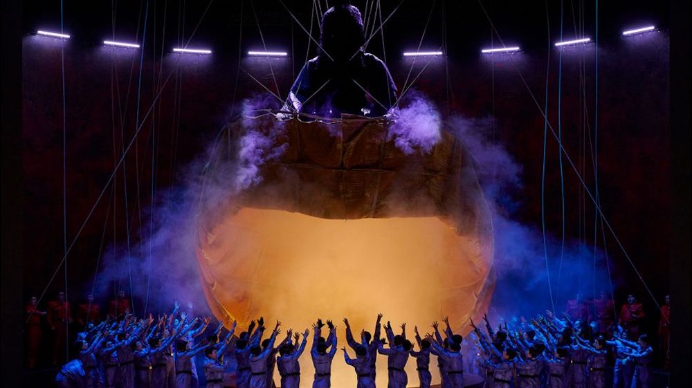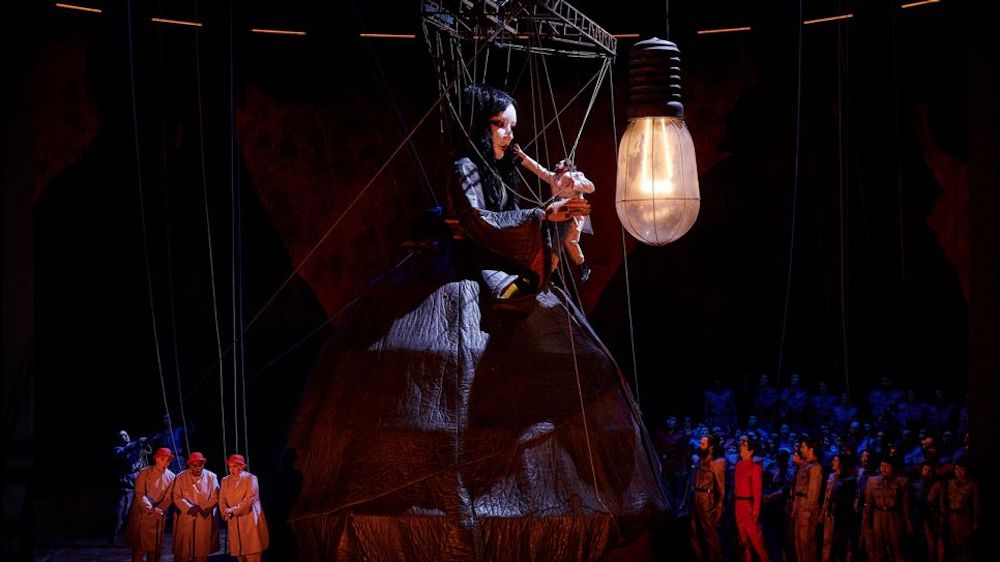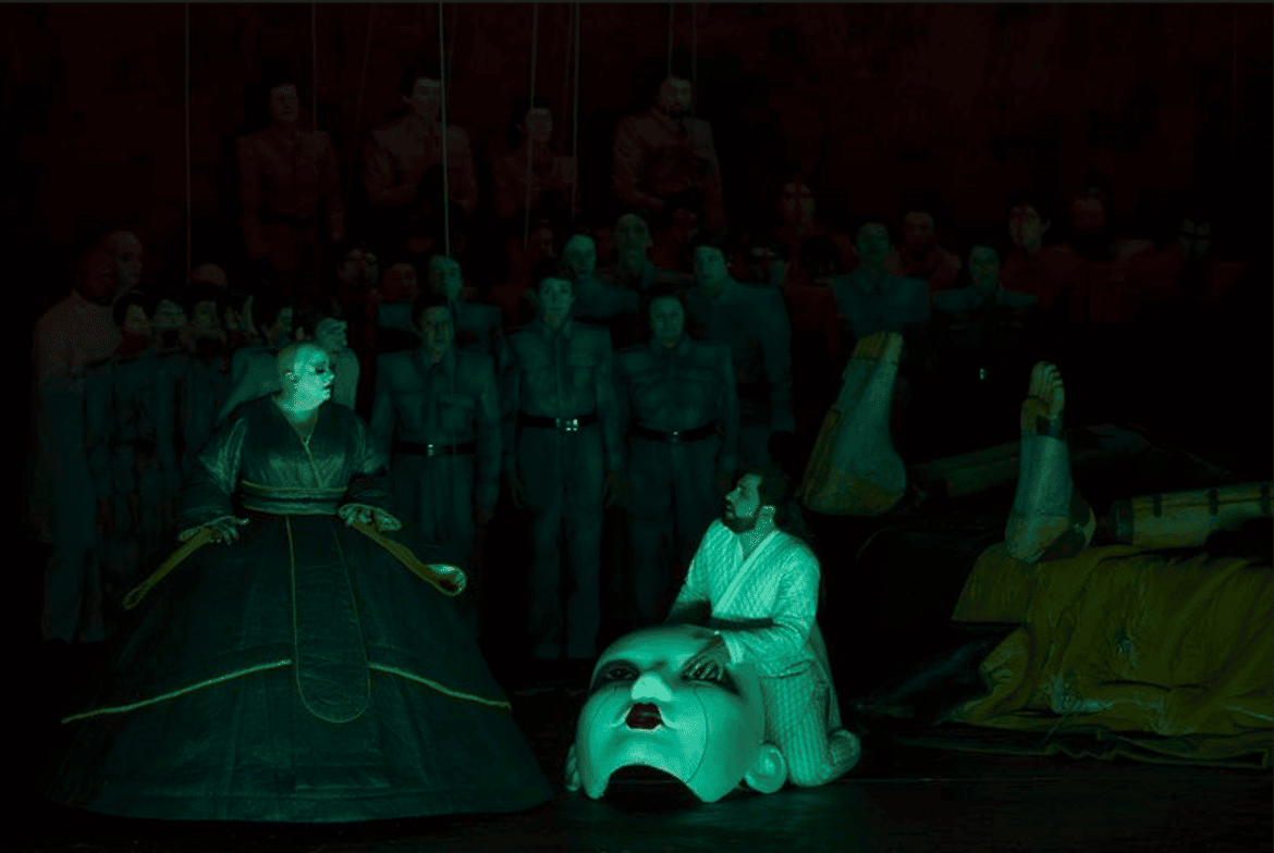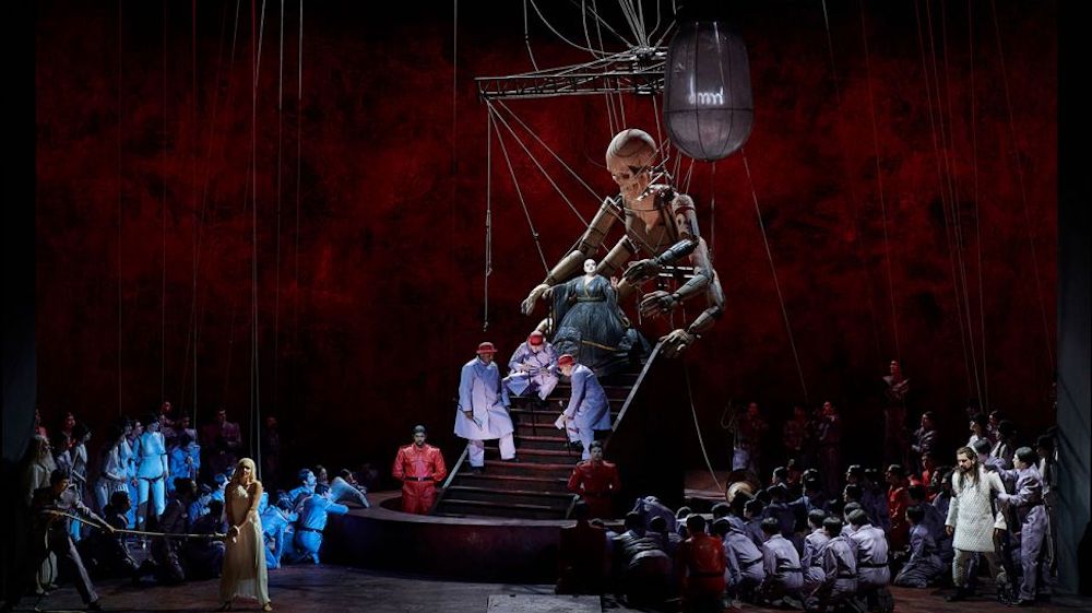 Comme le Hoffmann des Contes d’Offenbach, Calaf tombe ici amoureux d’une poupée, ou plutôt d’une marionnette, qui a les traits de la princesse Turandot. Comme sur la scène aquatique de Bregenz de Rigoletto l’année dernière, Philipp Stölz et la scénographe Franziska Harm construisent une énorme figure tirée  par des fils, qui encombre presque toute la scène, une figure vénérée par le peuple : un fétiche religieux, une divinité à laquelle on fait des sacrifices humains. En réalité, un instrument de domination et d’oppression du peuple puisque nous ne sommes pas dans la Chine millénaire de la fable de Gozzi, mais dans une dictature orientale où tout le monde porte un uniforme gris.