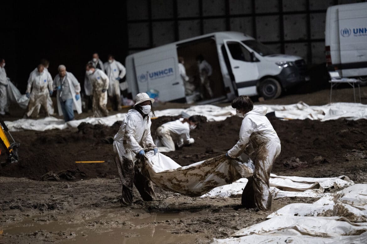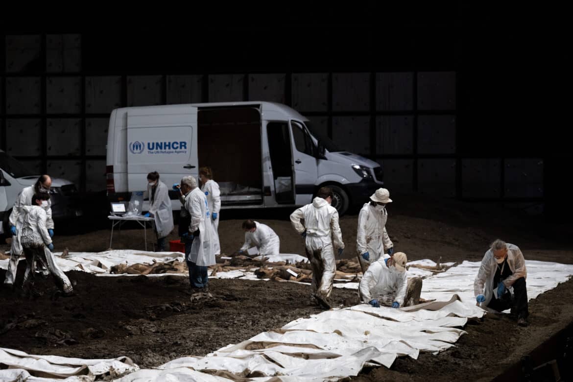 La mise en scène frappe d’emblée : un plateau grand comme un stade rempli d’une boue épaisse sur laquelle passe un cheval blanc magnifique de puissance. Une personne arrive, puis toute une équipe, qui découvrent peu à peu des cadavres ; l’excavation d’un charnier durera toute l’œuvre, corps après corps – le principe est la multiplication –, avec des camionnettes floquées UNHCR montant sur scène, accompagnées d’une pelleteuse, sous l’objectif d’un caméraman. Les ouvertures vers l’extérieur justifient certaines symboliques. Ainsi, s’opposent nettement le statisme de la mise en scène minimaliste, et la richesse dramatique et chatoyante de la symphonie viennoise. Une telle redondance (sur le mode funéraire) peut être perçue comme une contradiction (avec les moments heureux, l’élan vers la lumière de la musique). Les couleurs grises-noires font échos aux collines du lieu, sa mort artistique, et rappellent les constructions de Rudy Riciotti (le Pavillon noir à Aix, le Mucem à Marseille…) ; et le sujet des réfugiés et de la guerre sale est bien sûr dans toute les consciences.