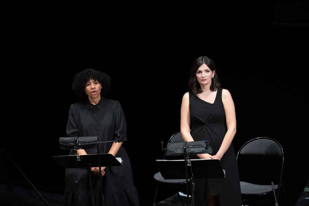 La mezzo française Marianne Crebassa possède une voix très timbrée, veloutée, ronde mais aussi claire et homogène, avec un bonne diction ; une technique sans reproche, au service d’une expression intense. Avec autant de talent, mais peut-être un peu plus de singularité vocale, la soprano lyrique sud-africaine Golda Schultz possède un timbre chaud, brillant avec des aigus aisés et magnifiquement timbrés. Des doublures instrumentales, par exemple avec la trompette solo, sont admirables. Le chœur est scindé en deux, les femmes à gauche, les hommes à droite, avec parfois des effets de lointain. Toute les parties vocales servent le texte à en donner des frissons. Bien que l’Orchestre de Paris ait joué la veille l’opéra Salomé (nous pensons à l’endurance des vents…), aucune anicroche n’est à déplorer. Bien au contraire, il démontre qu’il est l’un des meilleurs au monde.