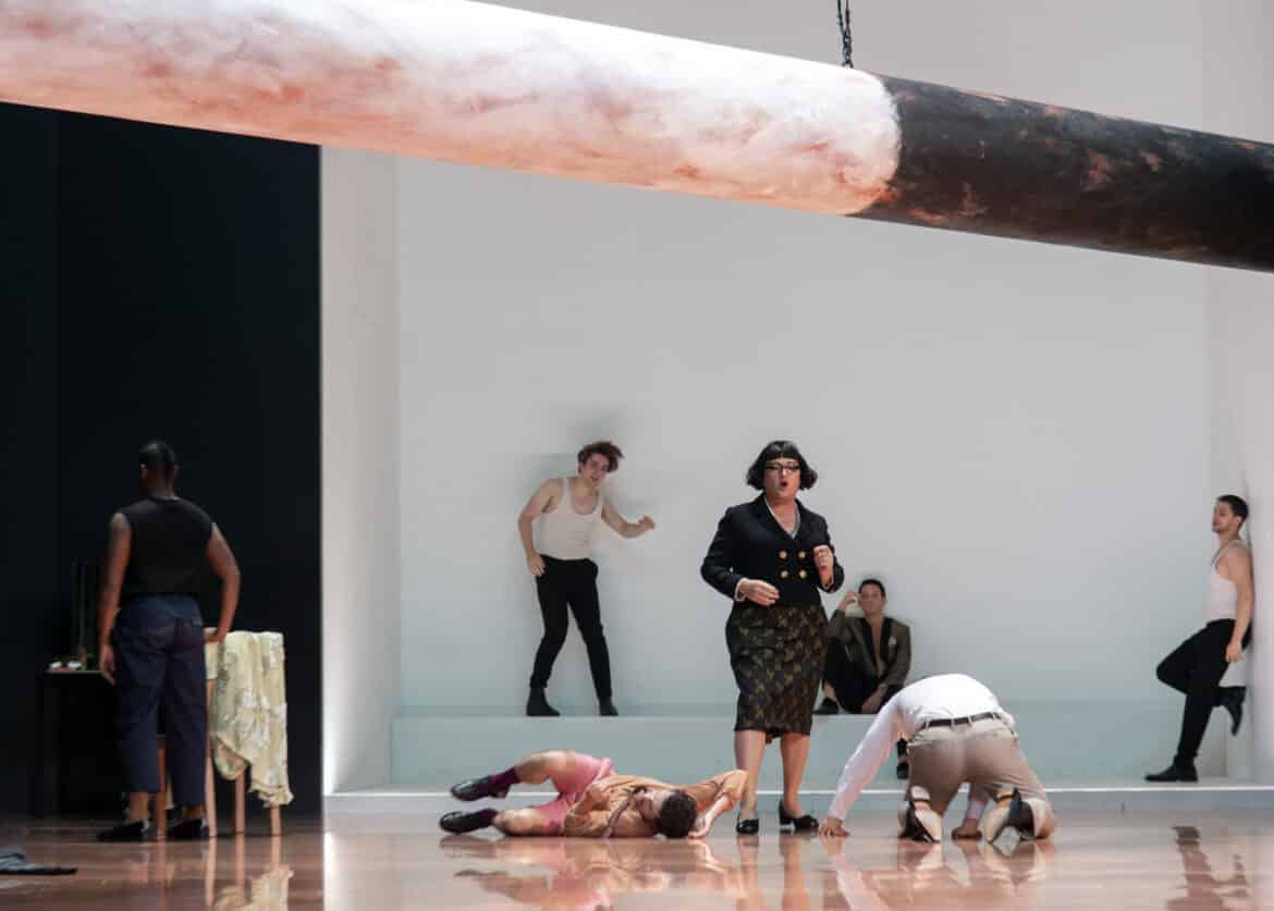 Le point fort du travail de Ted Huffman réside en fait dans la direction d’acteurs, absolument parfaite. Othon (est-ce le fait qu’on lui fasse porter une culotte courte ?) est scéniquement peut-être un peu moins à l’aise que ses collègues, mais globalement la troupe de chanteurs-acteurs réunis (beaucoup d’entre eux, comme Ted Huffman d’ailleurs, sont des anciens élèves de l’Académie) est absolument formidable de jeunesse, de beauté, d’engagement et de crédibilité. Le travail effectué en amont est évident, de même que le plaisir éprouvé par chacun d’entre eux à être présent sur scène pour chanter et jouer la comédie. Mention spéciale au Néron de Jake Arditti, qui prend des airs de petite frappe à la Vincent Cassel tout à fait bienvenus, de même qu’aux Nourrices, jouées (et fort bien chantées !) par le ténor Miles Mykkanen.