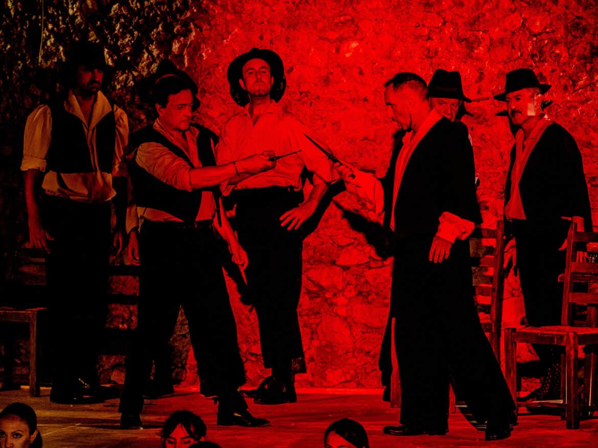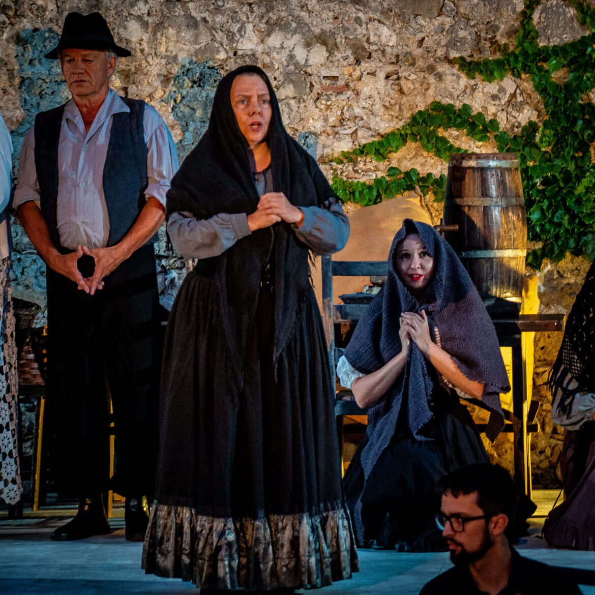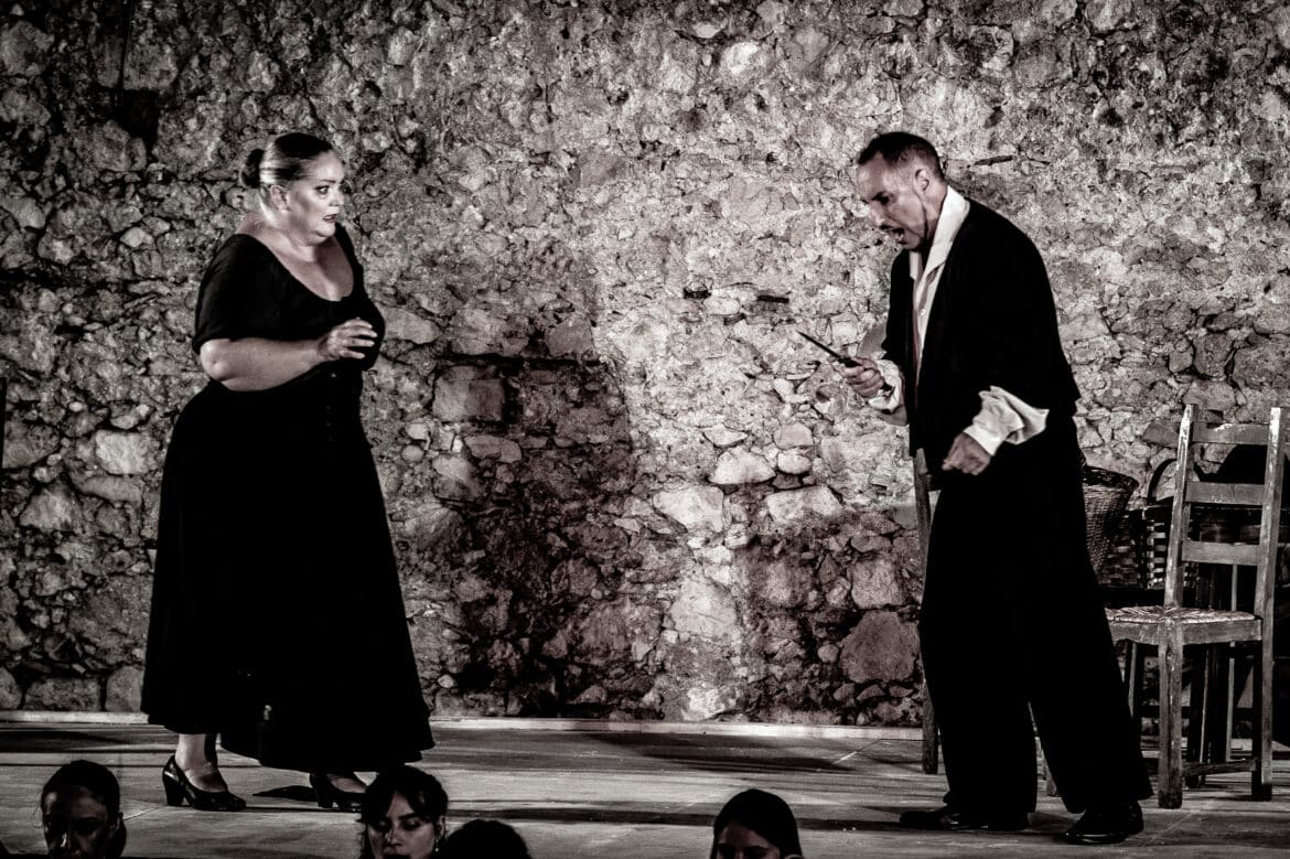 Avec à son actif quelque soixante chorégraphies en Italie et en Russie, une quarantaine d’opérettes et une quinzaine de comédies musicales en Italie et en France, notamment à l’Opéra de Nice et au Théâtre Musical de Lyon, Serge Manguette met à contribution sa solide expérience dans ce Cavalleria Rusticana où les tons prédominants noir, gris et blanc des costumes ne sont pas sans rappeler la grande époque du cinéma néoréaliste italien de Vittorio de Sica ou Roberto Rossellini. Profitant des multiples plans offerts par le théâtre de plein air, Serge Manguette (bien secondé par les lumières de Bernard Barbero, chef éclairagiste de l’Opéra de Nice) les utilise à plein et avec discernement : frondaisons, muret en forme de descente vers la place, plateau de scène, église. La maison au lointain devient la demeure d’Alfio livrant l’image de Lola enveloppée d’un drap blanc, après son étreinte nocturne avec Turiddu. Plus tard, elle étendra les draps comme pour effacer les traces d’une nuit d’amour adultère et à l’annonce de la mort de Turiddu, c’est un immense tissu rouge, symbole du sang versé, sur lequel se refermeront inexorablement les volets pour clore les affres d’une implacable tragédie. Tout est ici pensé, soigné, précis, évocateur. Utilisant une réduction écrite par Mascagni lui-même, Bruno Membrey dirige avec autant de soins que d’efficacité la formation orchestrale qui accompagne, lors du célèbre intermezzo, l’« Ave Maria » de Mascagni chanté par Svetlana Lifar. Une mention spéciale pour le chœur sous la houlette de Matthieu Peyrègne. Les voix juvéniles qui composent cette phalange apportent à l’oeuvre une fraicheur appréciable.