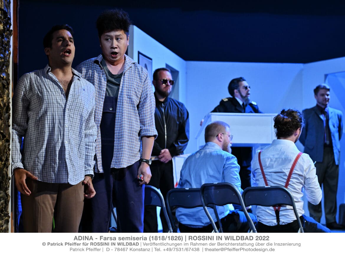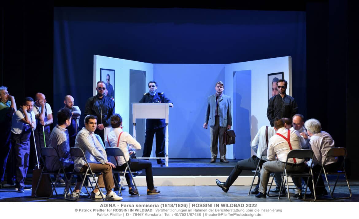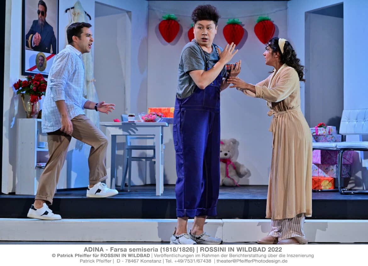 Après la magie noire d’Armida et le tragique intense d’Ermione, le festival de Bad Wildbad a proposé une pause rafraîchissante avec la charmante Adina, œuvre de commande composée par Rossini en 1818 à la demande du préfet de police de Lisbonne, créée en cette même ville huit ans plus tard seulement – pour disparaître pendant 135 ans avant d’être reprise à Sienne en 1963. Le livret, signé Gherardo Bevilacqua-Aldobrandini, n’est qu’une énième turquerie mettant en scène un couple d’amoureux, Adina et Selim, tentant d’échapper à un Calife ayant jeté son dévolu sur la jeune fille avant de s’apercevoir, in extremis, qu’il s’agit de sa propre fille. Les assez nombreux emprunts de cet opéra à d’autres ouvrages, de même que son intitulé (« farsa ») et sa courte durée (un peu plus d’une heure) expliquent sans doute l’indifférence dans laquelle il a longtemps été tenu, avant que d’intéressantes reprises, à Pesaro notamment (en 2018, avec Lisette Oropesa, Lévy Sekgapane et Vito Priante), ne permettent d’en redécouvrir les beautés. Au nombre de celles-ci, citons le duo entre Adina et le Calife (« Se non m’odi, o mio tesoro »), le trio « Oh qual notte orrenda è questa ! », rappelant d’assez près les tourbillonnants finales des premiers actes du Barbier ou de Cenerentola, et surtout la très belle scène que chante Adina lorsqu’elle croit que son bien aimé est mort (« Dove sono? Ancor respiro ? ») – une scène où la farce fait momentanément place aux accents on ne peut plus graves du registre serio. Signalons également que pour pallier l’absence d’une page (non composée par Rossini), Fabio Tranchida a eu l’idée d’insérer un extrait de La Schiava in Bagdad de Pacini entre le chœur « Vezzosa Adina » et le duo « Se non m’odi ». La progression dramatique gagne ainsi en fluidité, et musicalement la page de Pacini s’insère tout à fait naturellement dans la partition.