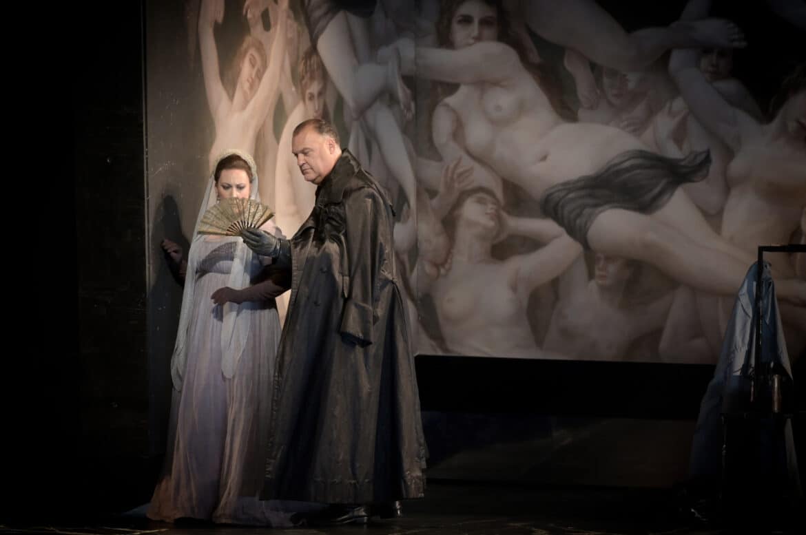 Sur le plan musical, la soirée réserve de belles émotions et quelques déceptions. D’emblée, Joseph Calleja fait entendre des aigus à la peine dans l’ardu « Recondita armonia… »… et ne les retrouvera guère de toute la soirée. À cela s’ajoute une certaine monochromie de timbre, que vient compenser une prestation scénique investie et crédible. Le ténor maltais est plus à son aise dans un poignant E lucevan stelle, pris à un train de sénateur par l’autrement pétulant Gustavo Dudamel (nouveau directeur musical de la maison, tout récemment promu Officier des Arts et des Lettres). La direction du chef vénézuélien, d’une précision redoutable, laisse à chaque pupitre l’occasion d’étinceler, voire de rugir, mais les voix ont parfois du mal à transpercer le formidable mur sonore que l’orchestre dresse entre les chanteurs et le public. La fosse, plus souvent qu’à son tour, rivalise avec le plateau. Le ravissement sonore continu, c’est Bryn Terfel et Saioa Hernández qui nous l’offrent. Le premier reprend avec assurance un rôle qui l’accompagne de longue date (et qu’il tenait déjà sur cette scène en 2016), et déploie pendant plus de deux heures une vocalità jamais prise en défaut. Le timbre est séduisant, nuancé, impérial, toujours projeté à bon escient. Impressionnant d’abjection dans le magnifique – et, osons le dire, zeffirellien – « Te Deum… » qui constitue le climax de l’acte I, Terfel parvient à glisser une once d’humanité dans son personnage lors de l’effroyable parade de séduction de l’acte II. Alors, comme Tosca, on serait presque tenté par un geste de pitié devant le cadavre de l’odieux baron.