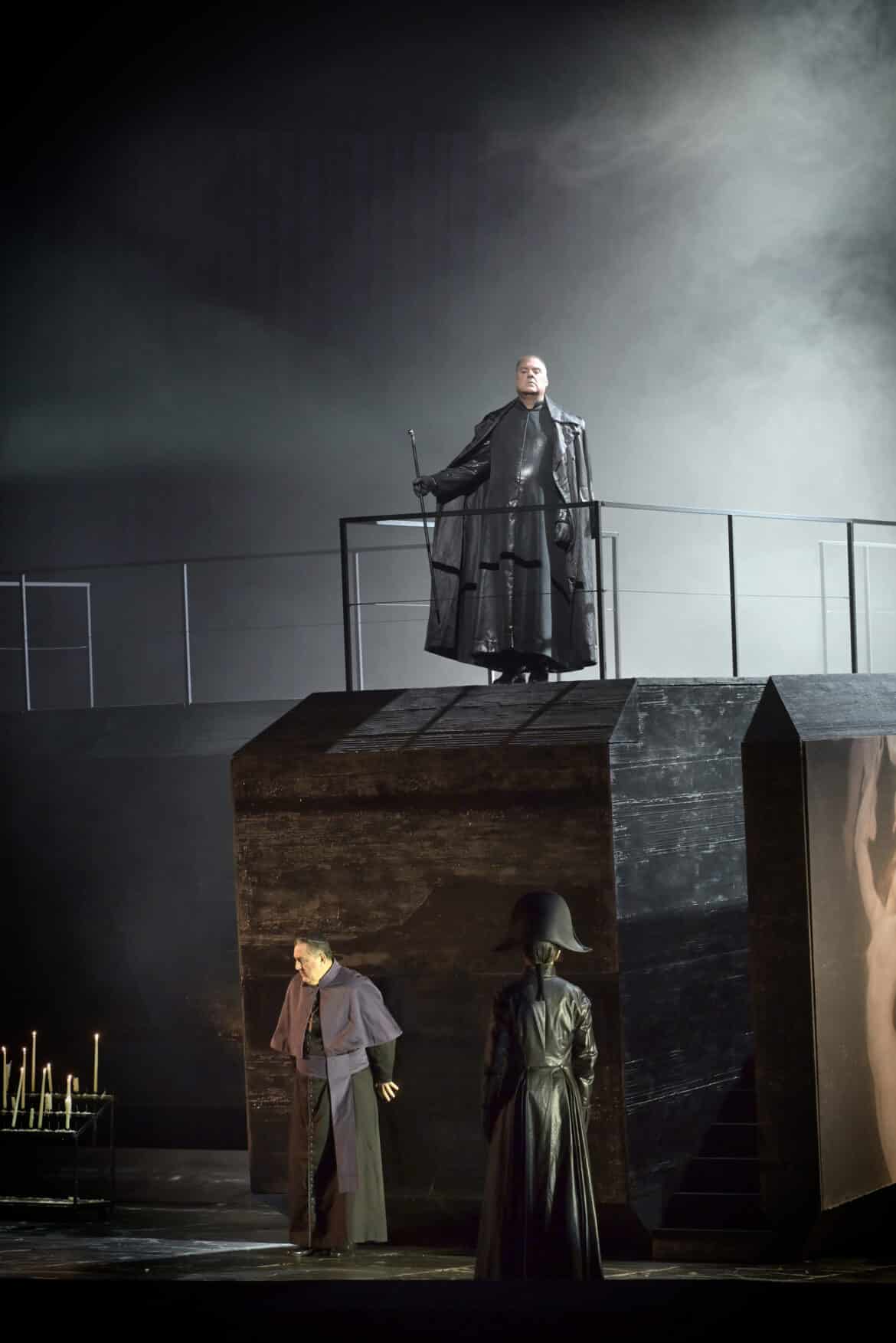 Au premier acte, à peine identifiable comme croix, elle évoque un bunker posé au milieu de l’église Sant’Andrea della Valle, où Cavaradossi s’affaire devant, non pas un portrait de Marie-Madeleine ayant pris les traits de la marquise Attavanti, mais une étrange fresque symbolico-érotique évoquant davantage Puvis de Chavannes que l’iconographie religieuse. Au deuxième acte, elle couvre le cabinet de Scarpia au palais Farnèse, sorte de matrice de la terreur aux murs tendus de rouge annonçant le sang de Cavaradossi torturé par mais aussi celui du chef de la police secrète poignardé par le « baiser de Tosca ». Au dernier acte enfin, elle plane sur une lande désolée – exit la terrasse du château Saint-Ange – où campent les soldats du peloton d’exécution fatal au peintre et, par contrecoup, à la cantatrice. Trois tableaux distincts mais unis par la même sophistication visuelle, jusque dans leurs plus infimes échos – le sacré des prie-Dieu et des cierges côtoyant le profane de la fresque érotique et du panier de victuailles, la lunette astronomique et la sphère ancillaire de Scarpia, symboles de sa pulsion scopique toute-puissante, et les arbres décharnés comme autant de gibets de quelque Golgotha.