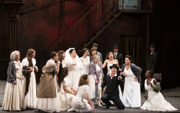 Rappelons encore ce seigneur fragilisé, probablement blessé de guerre, portant un appareil orthopédique à sa jambe droite, sorte de ramoneur des faubourgs lors du déguisement. Les aspirantes épouses, apparaissant quand le chœur « Scegli la sposa, affrettati » annonce l’entrée de Dandini, donnent presque l’illusion de les entendre chanter, alors que, on le sait, les chœurs de La Cenerentola sont entièrement masculins : l’effet de surprise est d’autant plus saisissant et la caricature désopilante. Le valet revêtant l’habit du prince ne peut alors que singer le mafioso, suivant un stéréotype bien enraciné, du moins à l’Opéra national de Paris, s’agissant d’opera buffa italien et plus particulièrement rossinien (souvenons-nous de la mise en scène conçue par Andrei Serban pour L’italiana in Algeri, au printemps 1998, toujours en ces lieux). Ce qui, par ailleurs, reste sans effet au moment de recouvrer sa propre identité, Ramiro retrouvant l’uniforme militaire de son rang, Dandini demeurant mafioso.