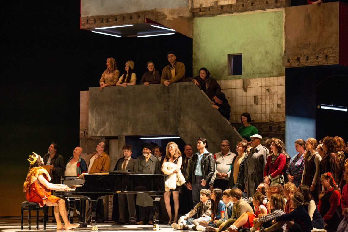 C’est une bien belle histoire. Mais ce n’est pas exactement celle de La Dame de Pique. La transposition-adaptation de David Marton n’apporte aucun éclairage nouveau sur l’opéra, mais donne la malencontreuse impression de plaquer artificiellement sur les œuvres de Tchaïkovski et Pouchkine un discours qui lui est parfaitement étranger. Au point qu’on en vient souvent à se demander : pourquoi diable David Marton n’a-t-il pas écrit lui-même l’histoire, le livret, l’opéra dont il rêve plutôt que d’utiliser celui de Tchaïkovski ? On aurait pu cependant adhérer plus ou moins à cette relecture si la mise en scène avait proposé des scènes fortes et marquantes sur le plan dramatique. Hélas, elle nous a semblé singulièrement privée de tension, si ce n’est peut-être dans le duo final entre Lisa et Hermann et lors du dernier tableau. Les passages censés être drôles sont juste irritants ; les scènes mimées devant le rideau fermé pour permettre les changements de décors entre les actes sont d’une rare indigence (un personnage saisit des jumelles, observe le dernier balcon en criant : « « Mamma ! » ; trois hommes mélangent consciencieusement et longuement divers liquides dans une bouteille avant d’en remplir trois verres et de les boire…) ; le parti pris de la laideur (murs moisis, papier peint décollé, poubelles dans lesquelles on fouille,…), qui culmine comme il se doit lors de la scène censée être la plus brillante de l’œuvre – à savoir la fête du troisième tableau au deuxième acte –, fatigue par son côté attendu, comme est attendu le fait de prendre systématiquement le contre-pied de ce que disent le texte et la musique : un personnage est-il censé être seul ? On le met évidemment en présence d’autres personnages (la Comtesse chante la romance de Grétry en dansant dans les bras d’Hermann ; Lisa, chantant son désespoir seule, la nuit près du canal au début du sixième tableau, est inexplicablement rejointe par Tomski, Tchékalinski, Sourine, Eletski…). La scène est-elle censée être peuplée d’enfants ? Ils sont bien sûr absents, leurs voix seules parvenant sur scène, retransmises par les fameux transistors… Bref, nous n’avons à aucun moment adhéré à cette lecture, dont nous n’avons jamais perçu la nécessité, la pertinence, la cohérence, la justification vis-à-vis de l’œuvre qu’elle sert.