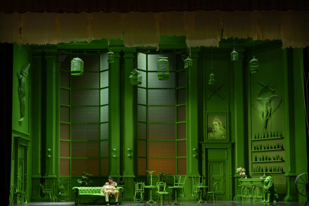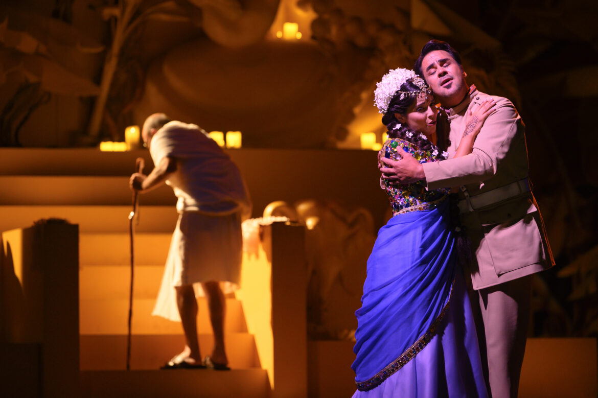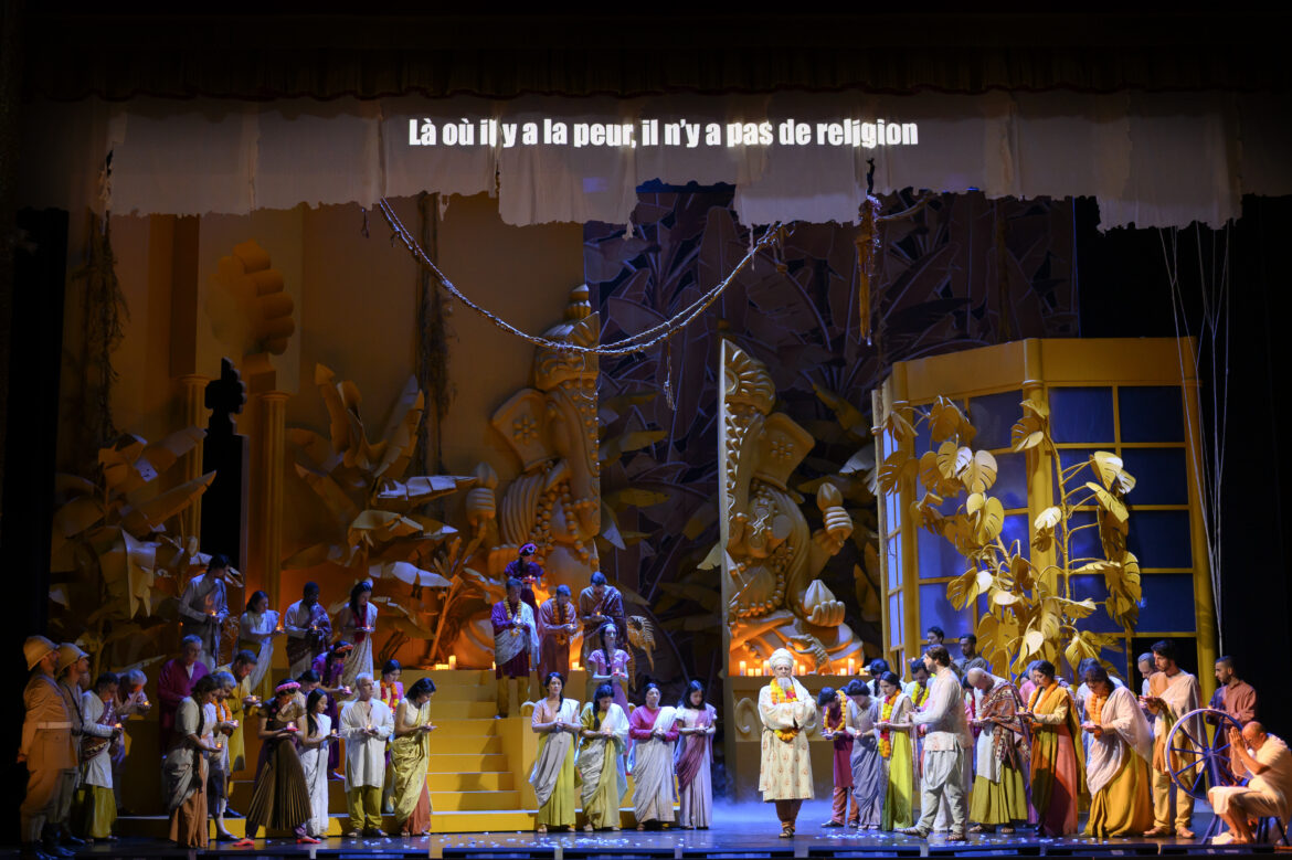 Colonialisme, patriarcat, violence des hommes, racisme : est-ce la présence de thématiques on ne peut plus débattues aujourd’hui qui permet à Lakmé d’acquérir une nouvelle visibilité sur les scènes internationales ? Quoi qu’il en soit, on sait gré au metteur en scène de ne pas avoir surligné à gros traits ces problématiques qui, pour importantes qu’elles soient, n’en deviennent pas moins un peu envahissantes  aujourd’hui sur les scènes d’opéras… Impossible bien sûr de faire l’impasse sur les questions liées au colonialisme et à la difficulté (l’impossibilité ?) pour deux cultures à ce point différentes de cohabiter pacifiquement, se respecter, s’apprivoiser : elles sont au cœur même de l’œuvre. Pour les aborder, le metteur en scène Davide Garattini Raimondi a fait un choix pour le moins original : il imagine que le jeune Gandhi assiste aux événements tragiques narrés par les librettistes Gondinet et Gille, et que les réflexions que ces événements feront naître en lui seront,  dans une certaine mesure, à l’origine de sa philosophie empreinte de tolérance et de pacifisme. Gandhi âgé est également présent sur scène : tout se passe comme si le vieil homme se remémorait cette histoire et la racontait aux enfants qui l’entourent, tout en leur transmettant les valeurs qui lui tiennent à cœur. Historiquement, l’idée est plausible (Gandhi est né en 1869, Lakmé est créée en 1883), mais elle aurait sans doute mieux fonctionné sans les projections insistantes de maximes gandhiennes (« Haïssez le péché, aimez le pécheur », « Là où il y a la peur, il n’y a pas de religion », « Il n’est pas nécessaire d’éteindre la lumière de l’autre pour que brille la nôtre »,…), le procédé, répétitif, s’avérant in fine lourdement didactique. La scénographie, imposante, alourdit également quelque peu le spectacle – surtout au premier acte, le troisième étant nettement plus réussi : le duo final des amants, de façon originale, se situe non pas en pleine forêt, dans une cabane  située « sous un arbre gigantesque et perdue dans les acacias roses, les daturas à double calice blanc, les tulipias jaunes », mais dans « un club house anglais typique » (dixit le metteur en scène) où Gérald et Lakmé ont trouvé refuge.