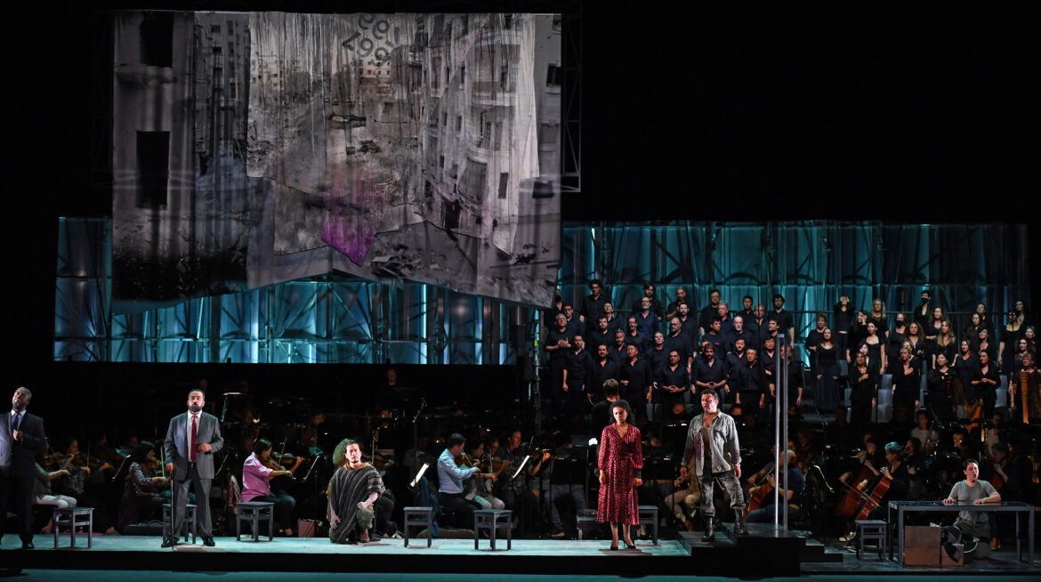 Transposée dans la guerre au Moyen-Orient, l’intrigue joue de la division de l’espace scénique. Il se déploie en toute visibilité sur trois plans, fermés par un sobre pan. Jouant sur l’avant-scène, les 6 protagonistes se partagent, côté jardin l’espace du pouvoir égyptien :  le Pharaon, la princesse Amnéris et le Grand Prêtre, distingués par de chics costumes actuels. En franchissant l’arc lumineux, côté cour, les Éthiopiens opprimés rassemblent la princesse Aida en captivité et son père Amonasro, tous deux en treillis de combat, la prêtresse en voile arabe traditionnel. Entre les deux camps antagonistes, le guerrier Radamès (en treillis progressivement maculé de sang) choisit finalement celui de l’aimée, Aida, qui le rejoint dans cet espace où la table figure leur tombeau. En second plan, l’orchestre national de Montpellier Occitanie jouit d’une pleine acoustique (et vision) sous la baguette éminente du chef letton, Ainãrs Rubikis (directeur musical de la Komische Oper de Berlin). En dernier plan, surélevé, la voile blanche de l’écran géant est animée de vidéos (à gauche), tandis que le chœur mixte (à droite) joue ses différents rôles depuis les praticables en gradin. Tour à tour, il incarne le peuple oppresseur, celui des prisonniers vaincus, des prêtres égyptiens, à la manière de la tragédie antique. Sans envahir le spectacle, les vidéos (Dick Straker) actualisent l’affrontement guerrier par des visions de l’anéantissement d’Alep (Syrie) ou bien, lors de scènes intimistes, par de gros plans sur le visage, les mains ou les pieds des protagonistes, couverts de plâtre fissuré, tels des statues ou des momies de l’univers archéologique. Serait-ce la métaphore de leur destinée brisée ? Ce 3e niveau est complété par une tribune d’où le Pharaon et le Grand Prêtre gouvernent. Dans la profondeur spatiale et acoustique du dispositif, spectateurs et spectatrices bénéficient d’une vision synoptique de l’œuvre d’art totale.