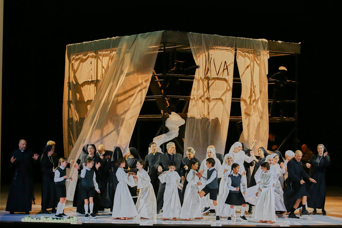 Sous la direction enflammée de VALERIO GALLI, la cantatrice polonaise Ewa Vesin a remplacé Keri Alkema initialement engagée pour le rôle de Tosca, avec brio, aux côtés de Mario Caravadossi interprété par le ténor flamboyant Riccardo Massi, complice de Cesare Angelotti interprété merveilleusement par la basse François Lis, tous deux persécutés par le perfide Scarpia, interprété par le talentueux baryton Daniel Miroslaw.