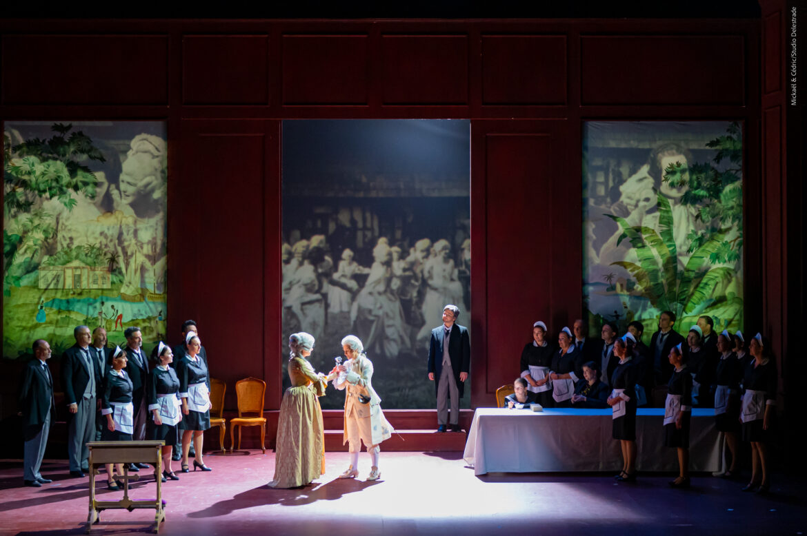 Assez éloignée d’un Regietheater omniprésent ces dernières années, la réalisation visuelle de Jean-Claude Berutti est de facture classique et permet un déroulé fluide de la straussienne conversation en musique. La scénographie de Rudy Sabounghi, surtout fonctionnelle, ne fait pas dans le luxe pour la chambre de la Maréchale au premier acte, ni chez Faninal au suivant, le dernier acte à l’auberge nous montrant les décors de hautes cloisons vus par l’arrière. À part de petites retouches du livret, comme le coiffeur Hippolyte joué par une femme ou encore le garçon noir Mohammed remplacé ce soir par une petite fille blanche, l’élément le plus marquant est la projection d’extraits d’un film en noir et blanc. On voit donc sur le tulle en avant-scène, ainsi que sur la paroi en fond de plateau, des images tirées du film muet Le Chevalier à la rose, réalisé par Robert Wiene en 1925, réalisateur davantage connu pour Le Cabinet du Docteur Caligari (1920). Les courtes séquences, parfois visionnées au ralenti ou à rebours, doublent ainsi l’action en cours sur scène, l’œil étant – comme souvent ! – irrémédiablement attiré par l’image.