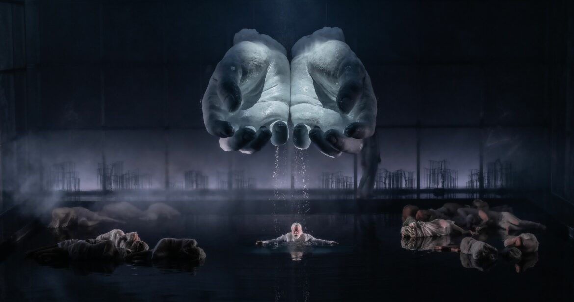 Scénographe, metteur en scène et costumier, Stefano Poda réalise un parcours visuel aussi spectaculaire qu’onirique, un esthétisme qui habitait sa réalisation hiératique d’Ariane et Barbe-bleue au Capitole (2019). Pour Rusalka, il impose une lecture symbolique du panthéïsme et de la condition humaine, plutôt que le naturalisme habituel (voir son interview sur le site du Capitole). Sur le plateau, le bassin aquatique est toutefois bien réel. Il est même immersif pour le peuple ondin : le trio des nymphes et l’Ondin chevelu y chantent, immergés en combinaison. Quant aux ondins (danseurs), leurs soubresauts batraciens ou leurs enlacements de plantes aquatiques sont d’une performance plastique très Art nouveau, un style d’ailleurs prégnant à Prague (Jugendstil). Cette matrice bleutée, dont les reflets froids se projettent sur les parois d’une boite de scène translucide, suggère bien « l’onde maternelle » qu’évoque le père Ondin et que fendent les pas de la sculpturale Rusalka. Là où la vision symboliste s’alourdit, c’est lorsque de géantes paires de mains humaines, à l’opposé des nageoires ambiantes, descendent des cintres et s’immobilisent telles de pesantes menaces au-dessus du bassin. Elles sont soit en position de vasques, soit en mouvement ascendant selon la quête métaphysique de l’ondine, ou bien métamorphosées en conque de rochers (3e acte) après sa malheureuse expérience terrienne. En revanche, la descente d’une Lune concave géante, lors de la fameuse balade dédiée, n’est-elle pas redondante ?
