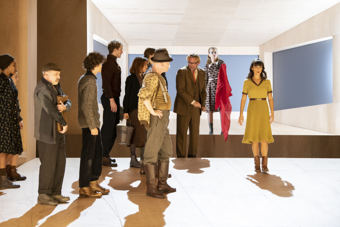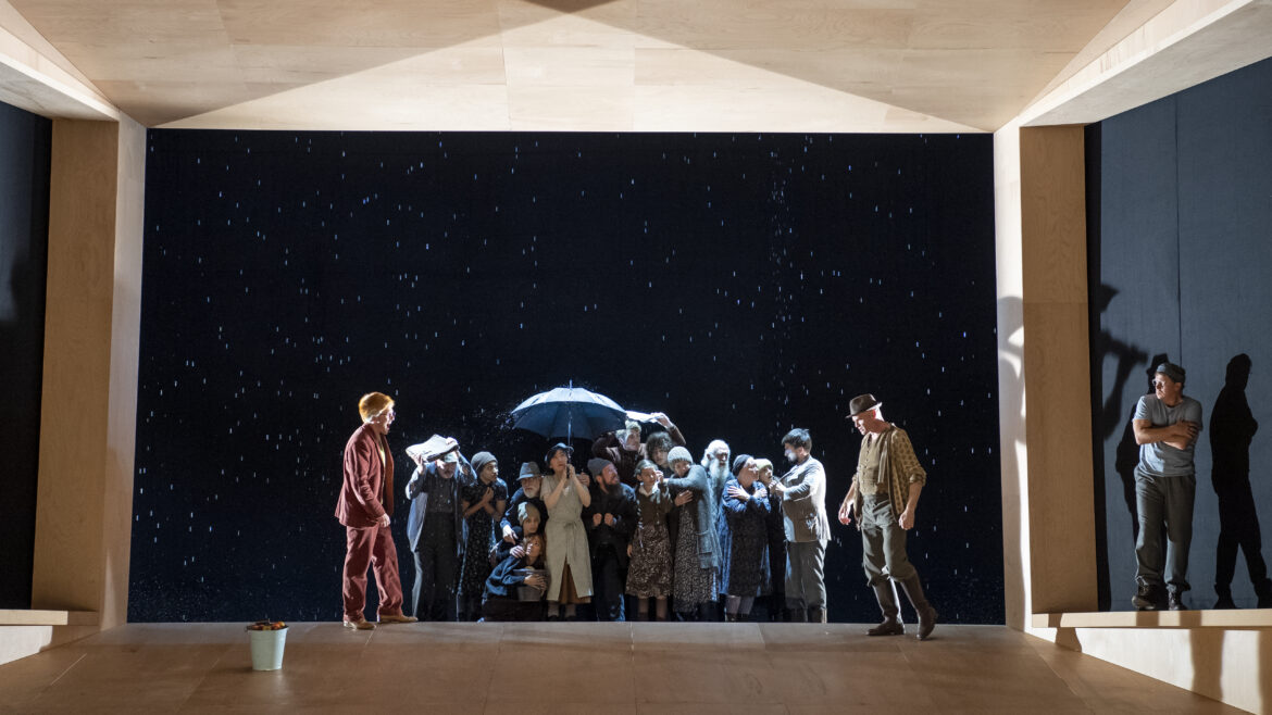 Lorsque, à l’orée du dernier acte, un orage bien réel éclate, c’est comme à son diapason que Katia surgit parmi la foule des villageois et, rongée de culpabilité, annonce à la foule son adultère avec Boris. Le chœur – étonnamment discret, pour un opéra de Janáček – se mue alors en foule haineuse, crachant son mépris sur l’infortunée. Un étrange ballet s’ensuit, magnifique inspiration de Tatjana Gürbaca : quelques jours après son aveu, devenue femme adultère battue par son mari, Katia retrouve Boris pour d’ultimes adieux – lui va être envoyé en Sibérie par son oncle, elle a déjà pris la décision de mettre fin à ses jours. Tandis que les deux amants, occupant cette fois l’avant-scène, échangent leurs dernières paroles et que Katia répète, comme un triste refrain, « je voulais te dire quelque chose », les personnages du drame apparaissent derrière eux et, chacun dans son coin, effectuent une série d’actions énigmatiques, répétées en boucle dans une logique de rêve : la Kabanicha se regarde dans un miroir tendu par sa domestique, Dikoj manque s’étouffer en mangeant une pomme, Tikhon refait à l’infini son nœud de cravate pendant que Varvara cire ses chaussures, une petite fille lance en l’air son ballon rouge… Il y a, dans ce manège temporel tragi-comique, quelque chose de l’inquiétante étrangeté du Tango de Zbigniew Rybczyński (court-métrage polonais de 1981). Comme si ne restait de la vie terrestre, si ingrate à Katia, qu’un simulacre absurde, dont la délivreront bientôt les flots glacés de la Volga…