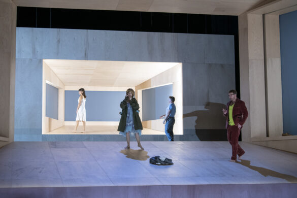 Et pourtant : pour dépeindre les tourments spirituels et sensuels qui mèneront au suicide la jeune Katia Kabanová, mal mariée au bourru Tikhon, malmenée par sa rude marâtre la Kabanicha et mal aimée par le fade Boris, la metteuse en scène berlinoise Tatjana Gürbaca a choisi de recourir à un décor minimaliste. Une sorte de boîte en bois clair, évidée sur ses trois côtés pour dessiner autant de cadres qu’animent et caressent des lumières pastel ou nocturnes, espace physique autant que mental dans lequel viennent s’inscrire des chanteuses et chanteurs dirigés avec une sensibilité et une intelligence rafraîchissantes.