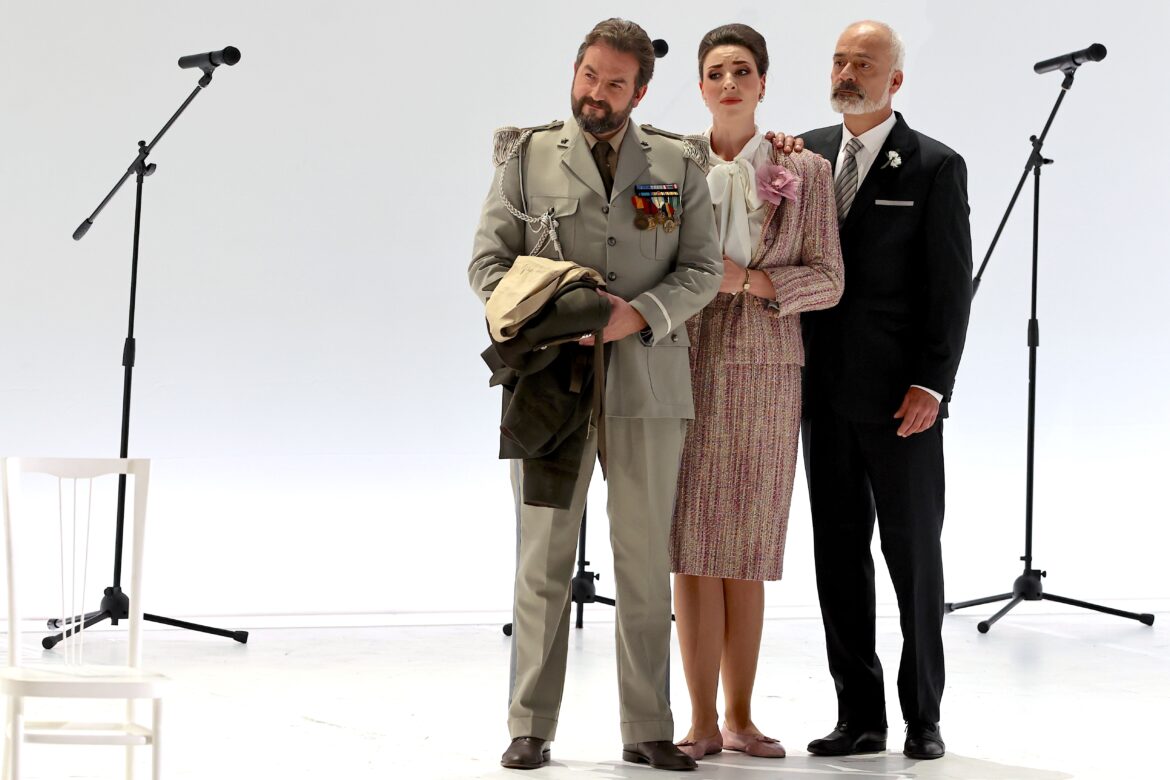 Du côté des chanteurs, beaucoup de talent, en particulier le trio féminin de tête. Cecilia Molinari est une superbe Béatrice, incandescente et légère à la fois, à la diction impeccable, avec de grands qualités scéniques, une voix colorée et égale sur toute la tessiture, et un phrasé toujours expressif et émouvant. Benedetta Torre, à la diction moins précise, gagne cependant en assurance et en puissance au fur et mesure du spectacle ; elle vient à bout très honorablement des périlleuses vocalises de Héro et livre une belle performance, très applaudie. Le mezzo chaud et puissant de Eve-Maud Hubeaux complète ce beau trio, triomphant dans un Nocturne suspendu, délicat et profond. Côté masculin, la partition sert surtout Bénédict, interprété par un Julien Behr au timbre lumineux et puissant, qui donne toute sa mesure dans le grand air « Me marier ? » de l’Acte I, parvenant à contrebalancer le statisme de la mise en scène par sa présence scénique.