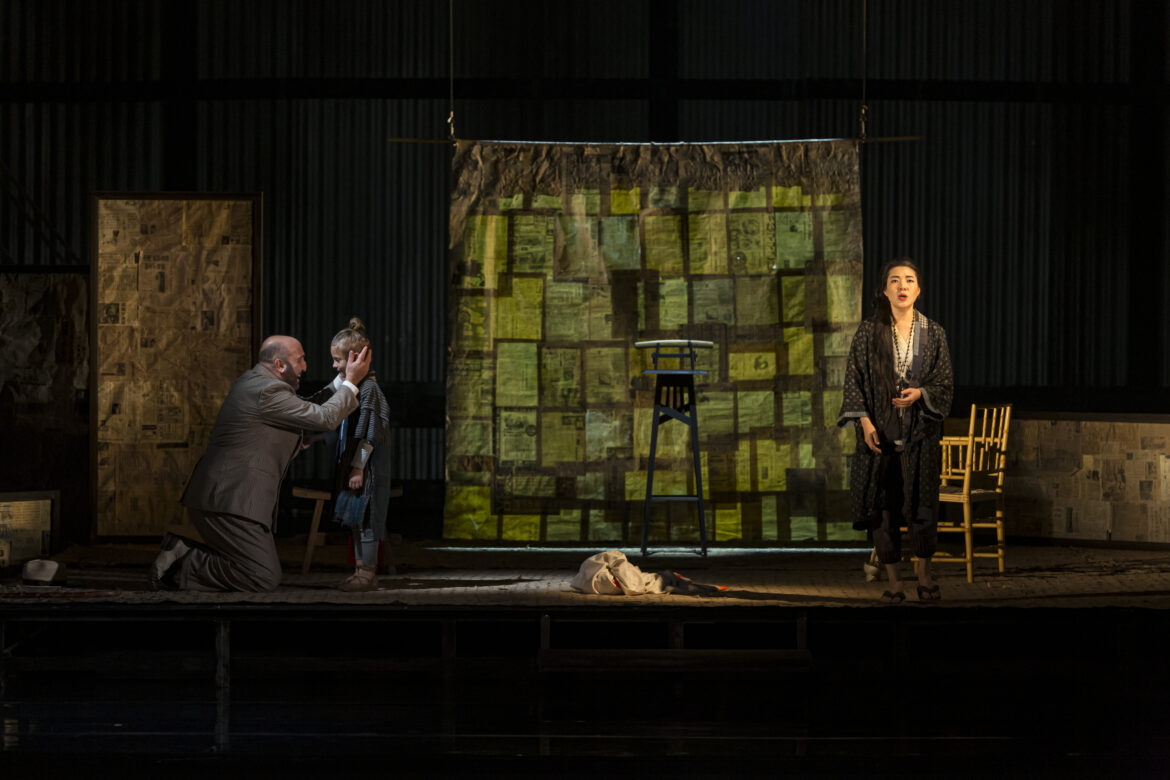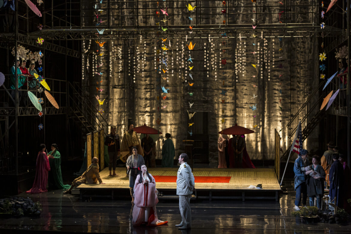 Un pont métallique surplombe la scène, échafaudages et tôles ondulées servent de cadre de scène. De cette ensemble « technique » naitront les éclairages (en lanternes de papier évidemment), les chorégraphies et les habillages à vue du chœur. Nous sommes au Japon mais aussi au théâtre et ce qui aurait pu enlever de l’émotion à l’œuvre n’en apporte que plus de puissance tant l’ensemble est au service du drame qui se joue. La direction d’acteurs est intelligente et aiguisée avec un léger regret pour les scènes secondaires mises en avant par cette version de la partition de Puccini dont nous avons parlé précédemment, et qui nous ont semblé parfois un brin surjouées. À noter, un très bel usage dramatique des costumes (le kimono de mariage de Butterfly et les costumes aux couleurs « acides » du chœur).