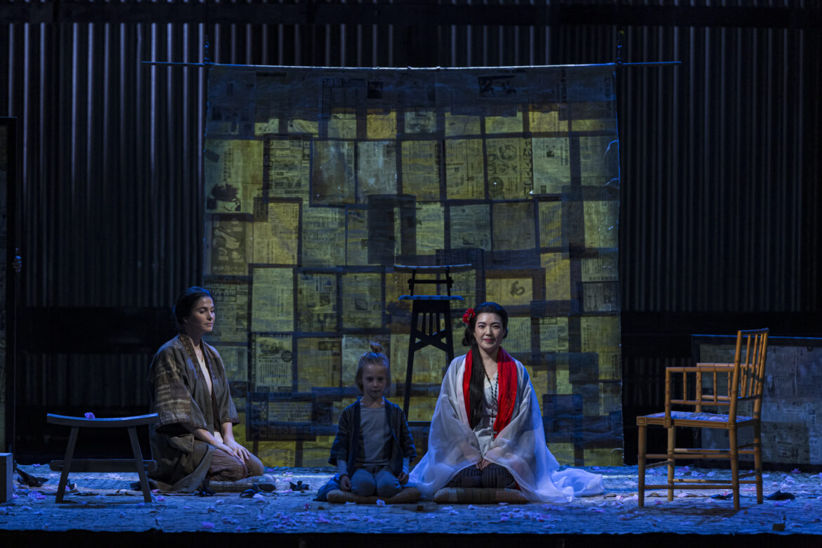 Cette production de Madame Butterfly signée Yoshi Oïda a été créée en 2016 à Göteborg. Le metteur en scène japonais était encore adolescent lorsqu’il a vécu l’occupation américaine du Japon après la seconde guerre mondiale et il sait avec poésie et finesse retranscrire ces contrastes civilisationnels profonds. Ancien membre de la troupe de théâtre de Peter Brook, Yoshi Oïda ne pousse cependant pas l’épure visuelle aussi loin que celle du metteur en scène britannique. Économie de moyens tout de même. Au centre de la scène un tatami sur une estrade, à cour et à jardin quelques bonzaïs, une fontaine et, pour habiller les espaces, quelques meubles et paravents aux inscriptions indéchiffrables pour le critique ignorant des idéogrammes japonais. Idéogrammes recouverts, au deuxième acte, de journaux qu’on suppose américains et qui soulignent l’abandon par Butterfly de sa culture au profit de celle de son époux. Le Japon, les États-Unis, le jardin et la maison sont bien là, la beauté de la nature s’habillant d’origamis.