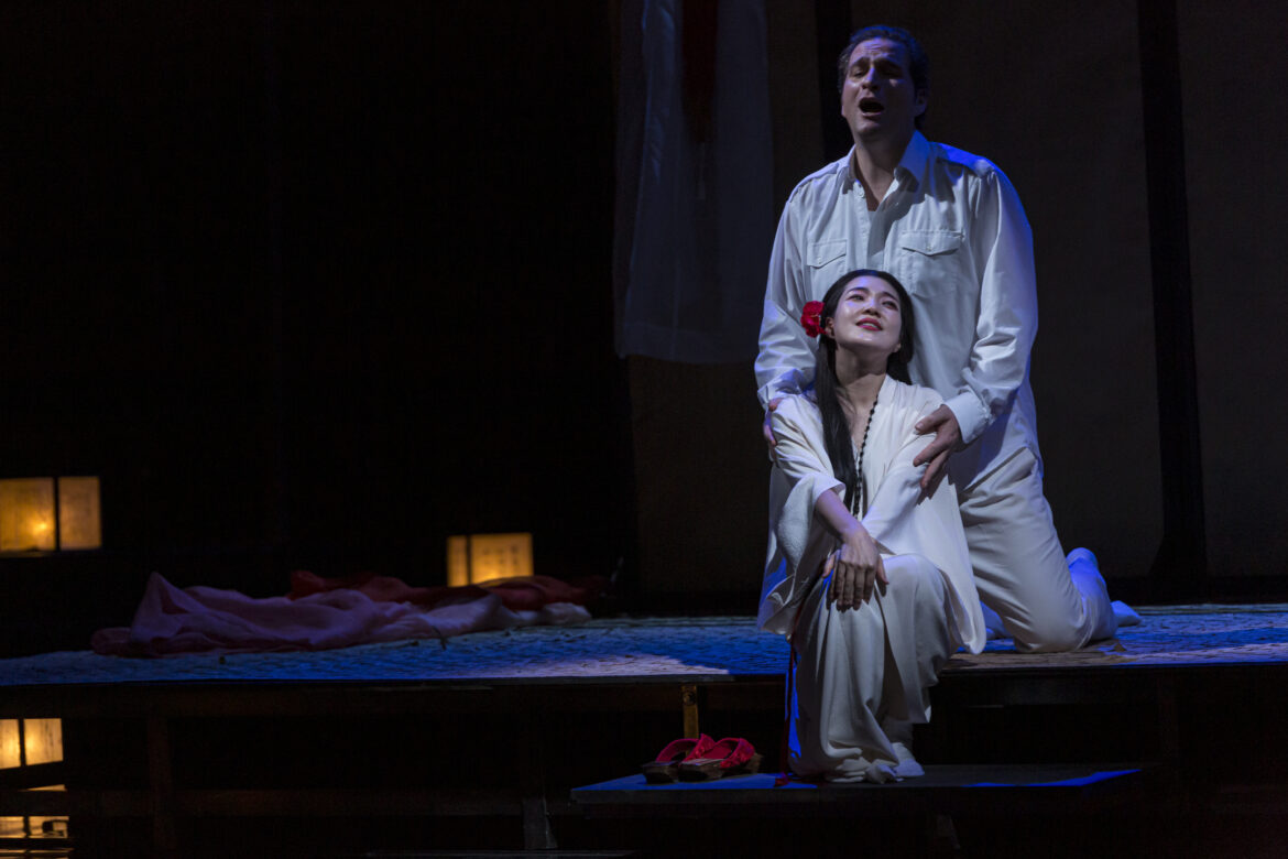 Karah Son se montre particulièrement émouvante en Cio-Cio San, un rôle qu’elle promène sur les plus grandes scènes lyriques mondiales et qu’elle a joué à la création de cette mise en scène. L’évolution psychologique de Butterfly est magnifiquement dessinée et l’actrice se révèle bluffante dans son portait de femme-enfant aveuglée par l’amour, à la fois victime mais aussi maîtresse de ses choix jusqu’à la fin tragique. Une fin moins sanglante qu’à l’accoutumée mais à la réussite visuelle incontestable. Vocalement, l’incarnation manque parfois de puissance avec un médium de la voix qu’on aurait souhaité plus présent, la soprano semblant s’économiser pour assurer sur la durée l’interprétation de ce rôle qui réclame endurance vocale et ressources émotionnelles. Le lyrisme attendu est pourtant bien là aux moments « cruciaux » de la soirée avec un « Un bel dì vedremo » bien conduit, à l’aigu final puissant et longuement tenu et un dernier air « Tu? Tu ? Piccolo iddio » intense et charnel.