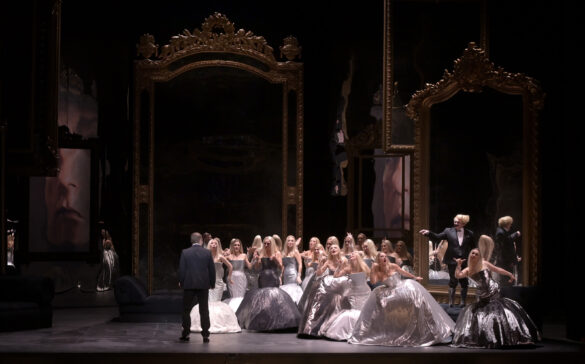 C’est d’autant plus dommage qu’après un premier acte, dont la mise en scène fait craindre un spectacle de patronage (mais c’en est de fait la caricature), le second est somptueusement réussi avec ses immenses miroirs, ses vastes canapés et surtout cette quinzaine de favorites toutes issues du monde des influenceuses, version Kim Kardashian en blonde, toutes habillées de robes fourreau-crinoline argentées inénarrables. Et le spectacle prend alors une autre tournure, que la suite ne démentira pas – si ce ne sont les quelques retours de mots crus, inutilement proférés sur un ton vulgaire assumé, lors de la scène de la prison.