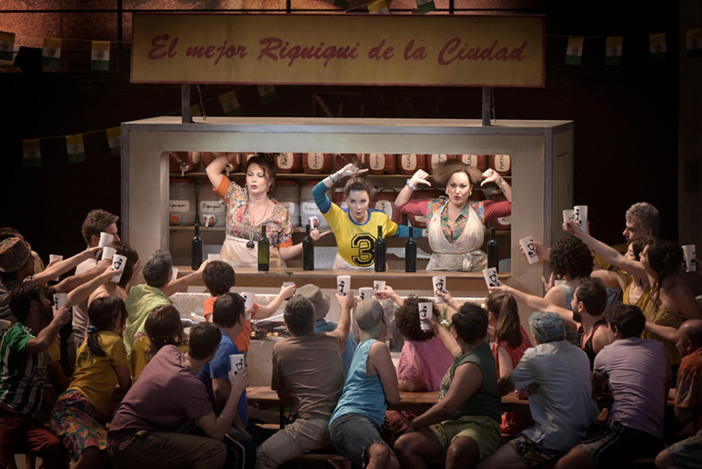 Musicalement, nous sommes à la fête. Si, à de rares moments, l’orchestre couvre un peu les chanteurs, il nous donne les musiques d’entracte trop rarement jouées, qui font entendre des solos d’alto et de clarinette onctueux. Quant aux voix, il y a la truculence des rôles masculins, à commencer par les deux sbires du Vice-roi, Don Pedro et Panatellas campés par Lionel Lhote et Rodolphe Briand, aussi drôles que bien chantants. Le Vice-roi de Laurent Naouri est toujours aussi à l’aise chez Offenbach depuis Orphée aux enfers. Chloé Briot, Alix Le Saux et Éléonore Pancrazi sont aussi convaincantes dans leurs rôles des trois cousines fantasques que dans celui des trois courtisanes méprisantes. Stanislas de Barbeyrac incarne un Piquillo traversé de doutes, homme fragile parce qu’amoureux, à la voix dont l’ampleur, dans les duos, a parfois tendance à couvrir sa partenaire. La musicalité de sa Périchole n’est pas en cause : Antoinette Dennefeld nous émeut (l’air de la lettre ou le « tu n’es pas beau » de la scène de la prison), nous chavire même à plus d’un moment (l’air de la griserie), mais parfois manque de liberté, comme si elle retenait un réel potentiel, alors que le volume de sa voix semble un peu en retrait. Le rodage du spectacle devrait rendre ces petits bémols caducs.