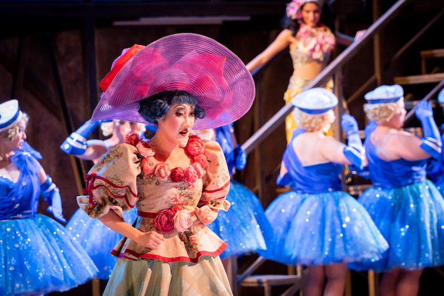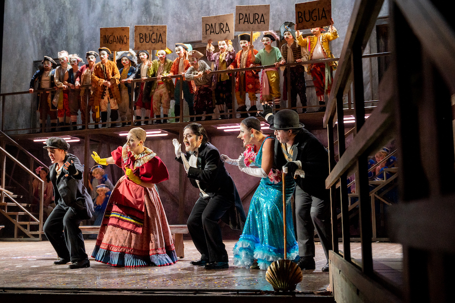 Comment, alors, mettre en scène ce désordre dramaturgique deux cents ans plus tard ? La voie choisie par le metteur en scène, scénographe et costumier Gianluca Falaschi et son équipe – Andrea Pizzalis pour les mouvements chorégraphiques, Emanule Agliati pour les lumières et Mattia Palma pour la dramaturgie – est de traiter le titre de Donizetti comme s’il s’agissait d’une œuvre de Gilbert & Sullivan, un autre Pirates of Penzance, en adoptant le kitsch visuel des anciennes productions de la compagnie d’opéra D’Oyly Carte, avec ses décors en papier mâché coloré, ses costumes criards et ses choristes et figurants qui volent la vedette aux premiers rôles, ou encore comme le théâtre de variétés italien des années 1940.