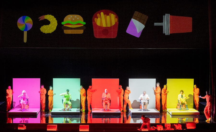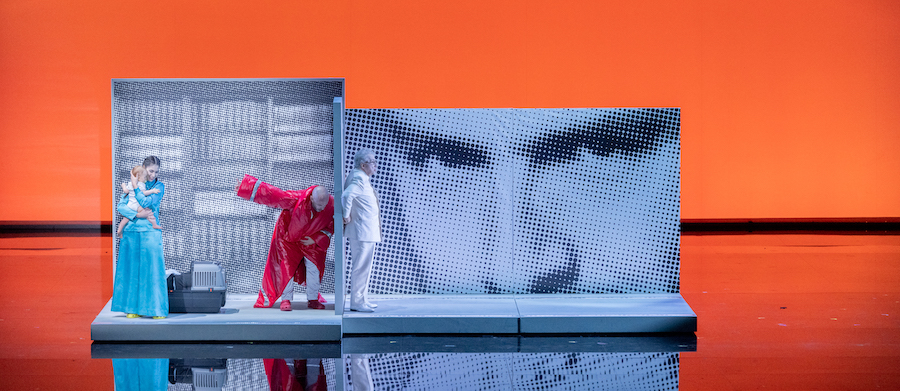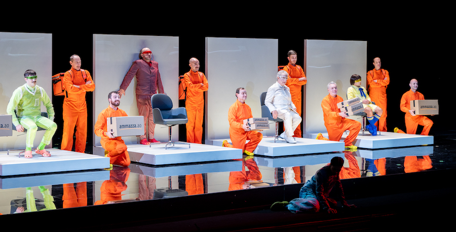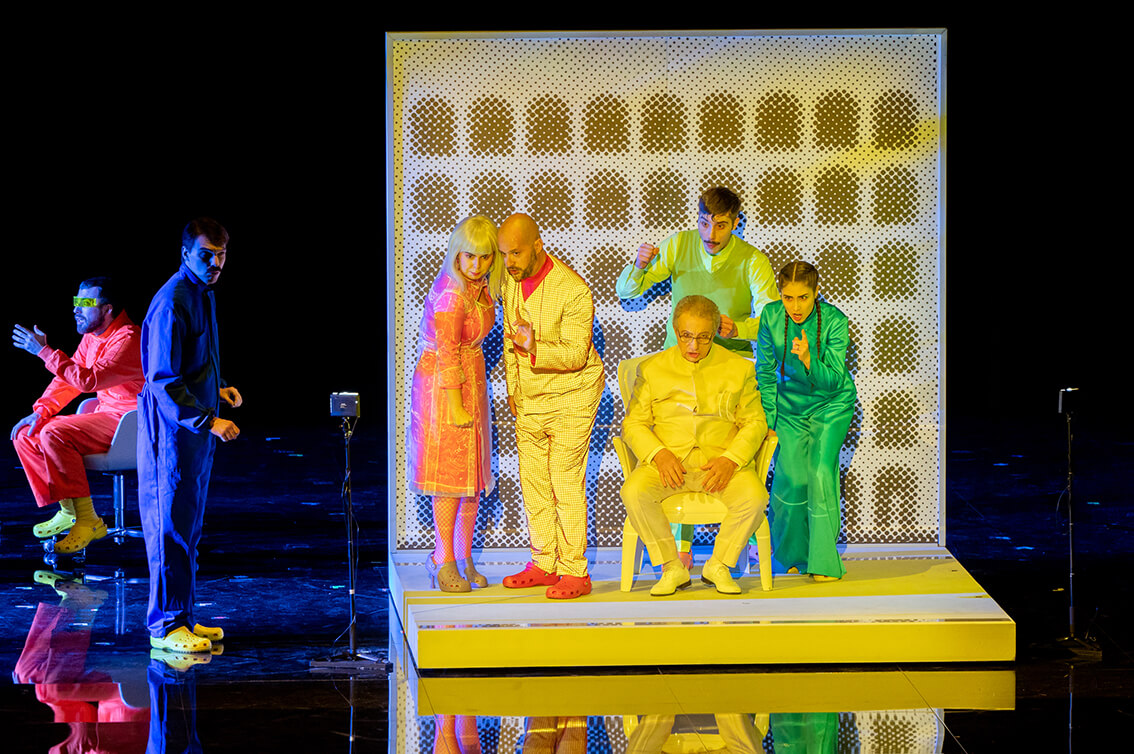 Tous ont leurs avatars, lesquels composent un monde coloré dans la scénographie de Mauro Tinti, qui divise la scène en deux niveaux : le monde réel en bas, les graphiques pop et flashy en haut. Il y a enfin un troisième niveau, au-dessus des deux premiers, où défilent les surtitres et où des compétences multiples sont requises pour le spectateur souhaitant suivre le spectacle sans rien manquer. Dans cette réalité virtuelle, la réalité fait soudain irruption au deuxième acte : le petit Bernardino a besoin de la nourriture que possède sa mère Gilda, enfermée dans l’appartement de son beau-père. C’est elle qui débloquera la situation et conclura l’opéra dans la liesse générale lorsqu’elle revêtira les vêtements du nouveau président (ou de la nouvelle présidente) de la République entre les silhouettes, cartonnées cette fois et non virtuelles, de deux cuirassiers. La mise en scène se révèle donc être très ludique, ce qui est également du aux éclairages de Petr van Praet, aux vidéos de Studio Temp, aux animations d’Emanuele Kabu et aux costumes colorés et ironiques de Giada Masi, que le public a chaleureusement applaudis. Ovations justifiées aussi pour les deux interprètes principaux !