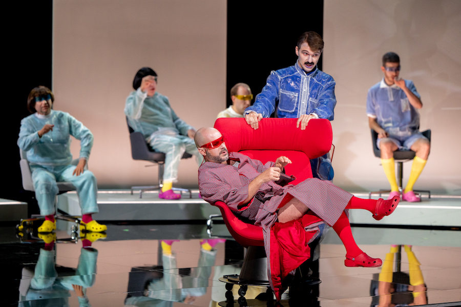 Une production aussi particulière nécessitait une mise en scène tout aussi spéciale, et c’est ce qu’a fait l’infatigable et volcanique directeur artistique du festival, Francesco Micheli qui, aidé du dramaturge Alberto Mattioli, est parti d’une réflexion sur la vie d’aujourd’hui : depuis deux ans, la pandémie contraint les jeunes à rester chez eux, à suivre des cours à distance et à ne pouvoir se réunir avec leurs amis qu’au travers des réseaux sociaux. Même Enrico et Pippetto, les enfants de Don Giulio, sont coupés du monde : alors pourquoi ne pas leur offrir la réalité virtuelle dans laquelle vivent nos jeunes ? L’histoire est donc transposée à l’époque actuelle. Pendant l’ouverture, on comprend pourquoi Don Giulio est seul et pourquoi sa relation aux femmes est compliquée : Don Giulio, jeune homme, a été abandonné par sa femme pour un dandy et ne s’en est jamais remis. Nous le retrouvons vingt ans plus tard – comme dans un feuilleton des plus classiques, en 2042 donc, dans un futur assez proche où les tendances d’aujourd’hui sont devenues la norme : Enrico trouve sa partenaire en surfant sur le web ; Gregorio est Greg, un influenceur obsédé par l’opinion des autres ; la nourriture et ses achats divers arrivent directement à la maison après qu’il a passé commande sur ammazza.ao, et tout le monde porte des lunettes de réalité augmentée. Don Giulio, enfin, s’est lancé dans la politique – Ferretti, dans le livret, le fait déjeuner avec un ministre –, ses positions étant positionnées très à droite.