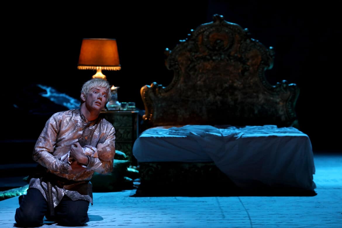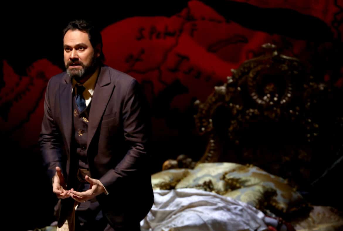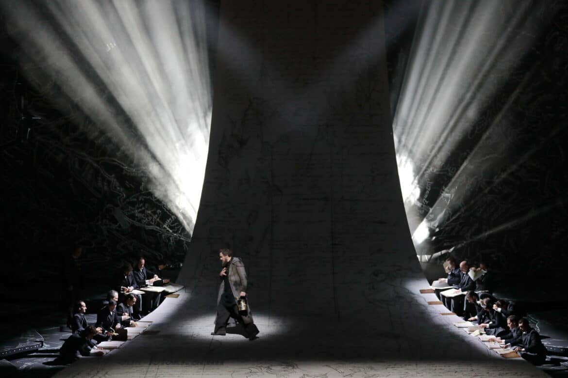 Sur le plan scénique, Kasper Holten situe tout l’opéra dans le cadre de la chronique de l’histoire russe écrite par le moine Pimen, ici excellemment interprété par la basse Ain Anger, qui incarne un témoin particulièrement encombrant pour le tsar alors qu’il se bat pour la liberté d’expression et contre toutes les sortes de censures imposées par le pouvoir, en écrivant sur un grand parchemin devenant au fil du spectacle un véritable « leitmotiv scénique » dans le décor créé par Es Devlin : s’impose ainsi, tout au long de la pièce, l’inexorable vérité historique… Pour donner un sens plus marqué au flux narratif de la chronique, dans lequel le passé, le présent et l’avenir s’entremêlent (un aspect que l’on retrouve également dans les costumes d’Ida Marie Ellekilde), le réalisateur danois divise l’œuvre en deux parties.