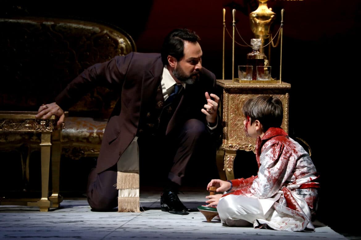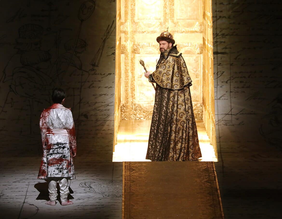 Dans la première partie, nous sommes témoins des circonstances entourant l’ascension de Boris à laquelle assiste le peuple, autre véritable protagoniste de l’opéra, victime impuissante – et antagoniste – du pouvoir absolu, incarné de manière exemplaire par le chœur de la Scala (dirigé par la main experte d’Alberto Malazzi), manipulé et intimidé par la cérémonie du couronnement. Dans la seconde partie, le langage scénique devient moins naturaliste, plus intimiste et parfois même surréaliste, le spectateur devenant un participant actif du drame intérieur vécu par Boris : les accès de culpabilité qui l’étreignent pour avoir ordonné la mort de l’héritier légitime du trône d’Ivan le Terrible, le Tsarévitch Dmitri, ponctuent son implacable entrée dans la folie à travers la vision du fantôme de l’enfant sanglant – une vision qui ne lui laisse aucun répit, ni à ses deux fils, Ksenija et Fëdor, respectivement et impeccablement interprétés par Anna Denisova et Lilly Jørstad, avec la prémonition d’un sort semblable menaçant de s’abattre sur ces derniers.