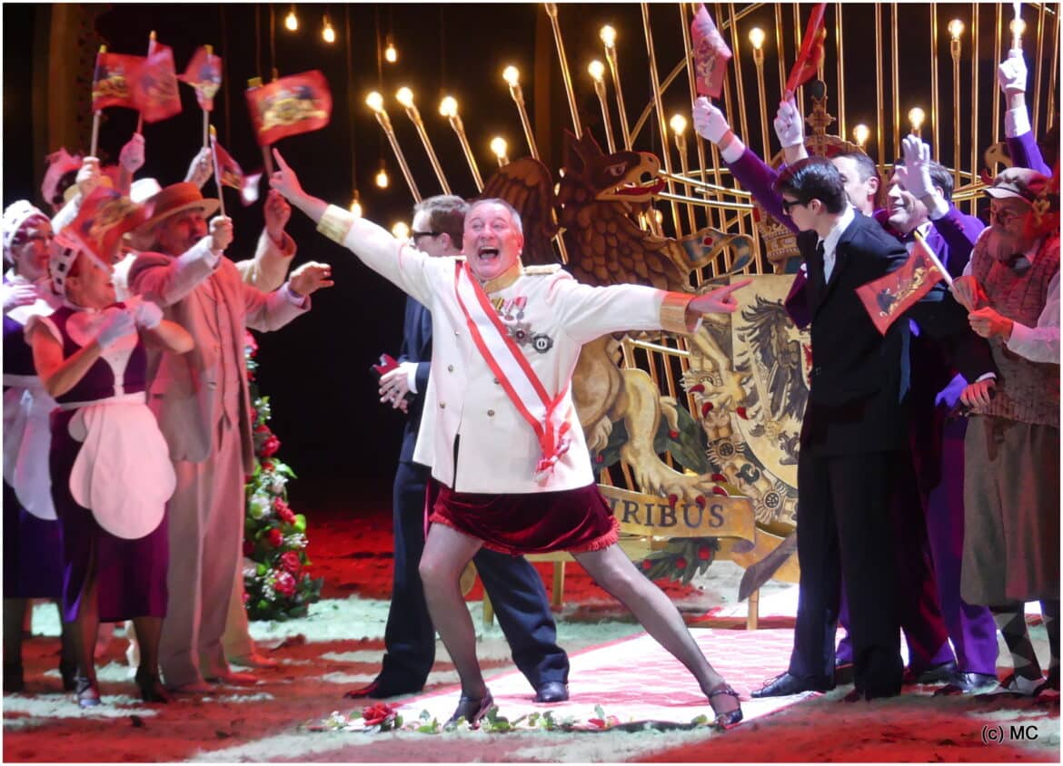 De l’Empereur – homme de pouvoir de toute époque – incarné par un impayable Francis Dudziak très fin-de-siècle, et un moment travesti en vieille aristocrate au porte cigarette télescopique toute droit sortie de Sunset Boulevard, au professeur Hinzelmann totalement dans la lune de Jean-Luc Épitalon en passant par le Célestin Cubisol, drolatique à souhait, de Guillaume Paire, les rôles de composition de ces messieurs sont au rendez-vous de la légèreté et du comique. On a évidemment plaisir à entendre sur la scène de l’Opéra de Marseille, Fabrice Todaro – inoubliable Zaza dans La Cage aux folles à l’Opéra de Nice il y a quelques années – qui compte à son tableau de chasse l’ensemble des rôles principaux de L’Auberge du cheval blanc ! Avec lui, le rôle de Piccolo, avec la gouaille qui le caractérise, devient presque du luxe…Si le Napoléon Bistagne de Marc Barrard en fait des tonnes dans ce rôle où triompha longtemps Fernand Sardou (on a souvent l’impression d’entendre la voix de l’ancien maire de Marseille, Jean-Claude Gaudin !), le Guy Florès de Samy Camps nous ramène davantage, avec son côté latin lover un tantinet bellâtre, au côté caricatural du genre Opérette. Quant au rôle taillé sur mesure du maître d’hôtel Léopold, nous n’avons pas été totalement convaincu par la voix manquant souvent de projection et de clarté de Léo Vermot-Desroches, dans des tubes tels que son air d’entrée « Ah, mesdames et messieurs » ou « Pour être un jour aimé de toi », ni par l’interprétation qui pourrait, selon nous, être davantage aboutie.