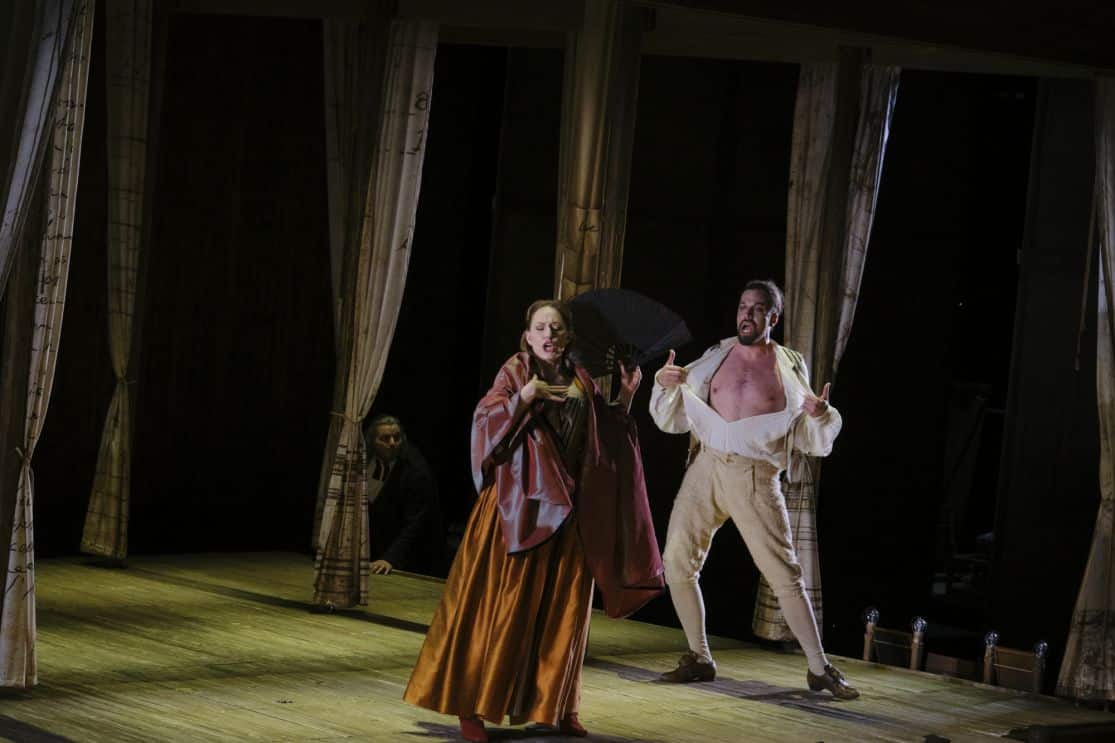 Il faut dire que, musicalement, c’est également la fête, grâce avant tout à Marc Minkowski qui souligne la vivacité, la tension dramatique de l’œuvre sans jamais la brutaliser, établissant des contrastes poétiques entre agitation (électrisant finale du II !) et rêverie nostalgique (le « Dove sono » de la Comtesse), ambiances diurnes et nocturnes (splendide introduction du « Deh, vieni » de Susanna au dernier acte), trivialité (les interventions de Basile ou de Marcelline) et noblesse de ton (les airs de la Comtesse). Du grand art ! Côté voix, la distribution est extrêmement équilibrée, avec des seconds rôles parfaitement investis et crédibles (très beau « Voi che sapete » du Chérubin de Miriam Albano) ; et c’est un match nul entre le peuple (Figaro et Suzanne) et la noblesse (Le Comte et la Comtesse), les deux couples rivalisant de talent vocal et d’aisance scénique. Robert Gleadow est un Figaro débonnaire et touchant dans sa révolte contre les femmes pleine d’amertume et de tristesse au dernier acte ; Angela Brower susurre un « Deh vieni » empreint de poésie, porté par une voix capiteuse et richement colorée. La Comtesse d’Ana Maria Labin séduit par son engagement et sa jeunesse (son « Dove sono » est particulièrement réussi), et la voix de Thomas Dolié se différencie efficacement de celle de Robert Gleadow, le chanteur français campant un Almaviva plein de morgue et d’autorité vocale, avec un « Ah no, lascarti in pace » tourmenté et orageux à souhait.