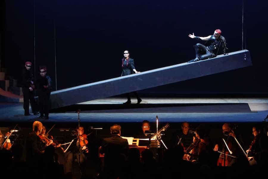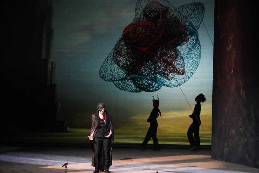 La scénographie et les costumes, réalisés par Monti lui-même, recréent des atmosphères futuristes et sombres où les masques et les maquillages lourds dissimulent une partie du visage des chanteurs, diminuant d’autant leur capacité d’expression. Le seul élément scénique est un monolithe suspendu en hauteur qui se transforme en scène, en plan incliné, en table, en mur. En arrière-plan, l’intrigante vidéographie de Cristina Ducci donne de la profondeur à une boîte noire aux parois courbes dans laquelle l’éclairage pas toujours précis d’Eva Bruno laisse parfois le chanteur dans l’ombre.