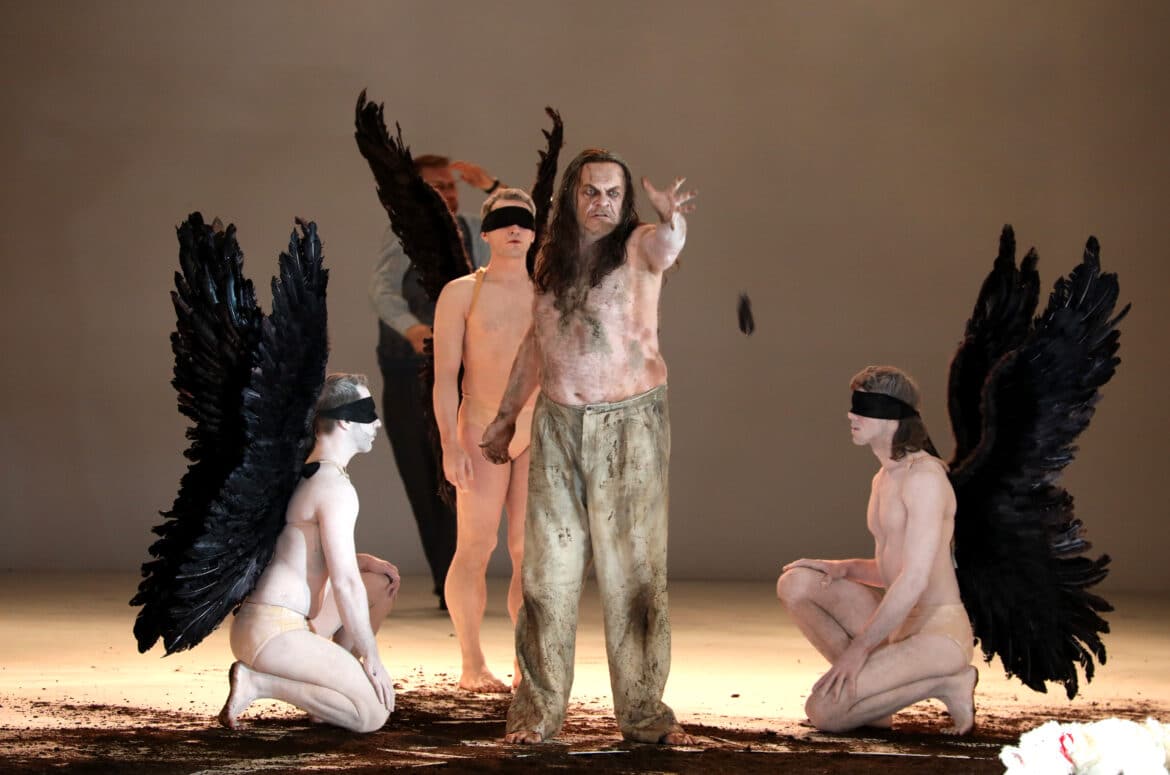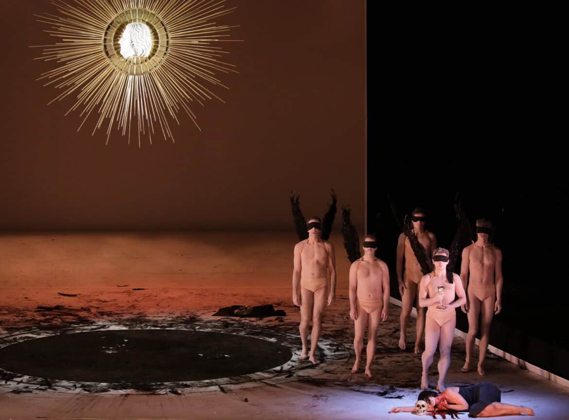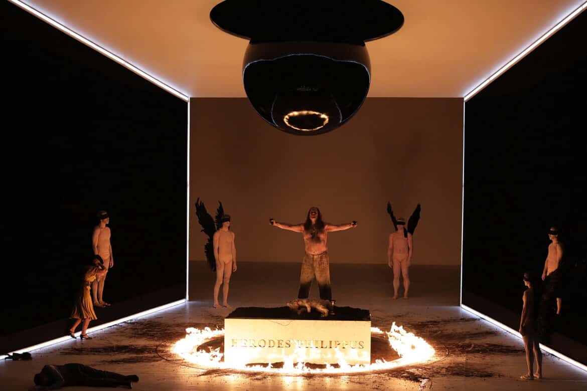 Même indifférenciation chez ces anges blafards aux yeux bandés et aux ailes noires – ces ailes dont Hérode semble entendre les battements funestes – qui viennent régulièrement arpenter le plateau. Officiants muets de ce rituel de mort, ils enserrent les protagonistes dans une toile invisible, et leur présence entêtante créé l’une des visions les plus fortes de cette production. Autre vision marquante, la tête du prophète décapité s’élevant au-dessus du puits, ceinte de rayons d’or, cite explicitement l’Apparition de Gustave Moreau (1876) et contourne avec élégance l’écueil d’un figuratisme gore.