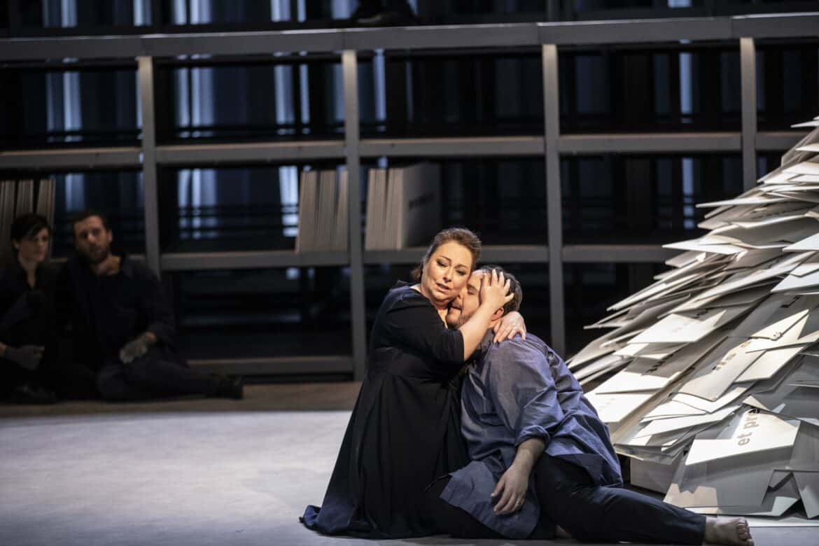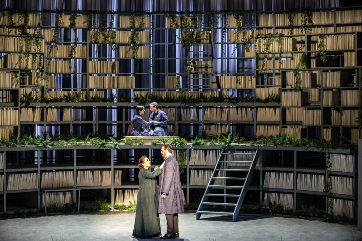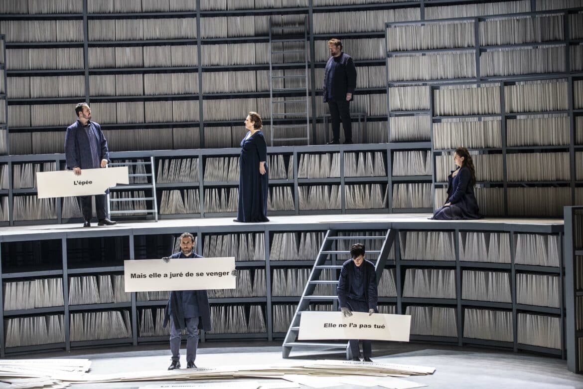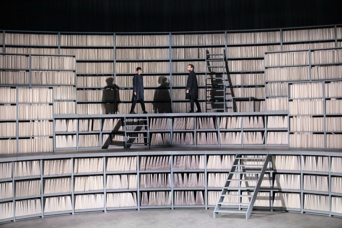 Parallèlement à ce dispositif disruptif, Tiago Rodrigues propose un Tristan assez proche d’une version de concert mise en espace. Au premier acte, la grande bibliothèque aux rayonnages encore pleins symbolise le navire qui conduit Isolde vers son destin : les différents plans de rayonnages sont comme les ponts superposés d’un bateau où les personnages évoluent sans vraiment se croiser. La force de l’action y est encore renforcée par l’absence totale d’accessoire : un panneau de carton biseauté sur lequel on peut lire « épée » placé dans la main de Tristan évoque son glaive à la lame ébréchée tandis que des panneaux intitulés « philtres de mort » et « philtres d’amour » passent entre les mains de Brangäne au moment où l’amie de la femme triste donne à boire aux amants le nectar qui les lie indissolublement l’un à l’autre.