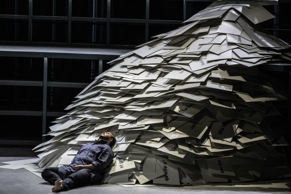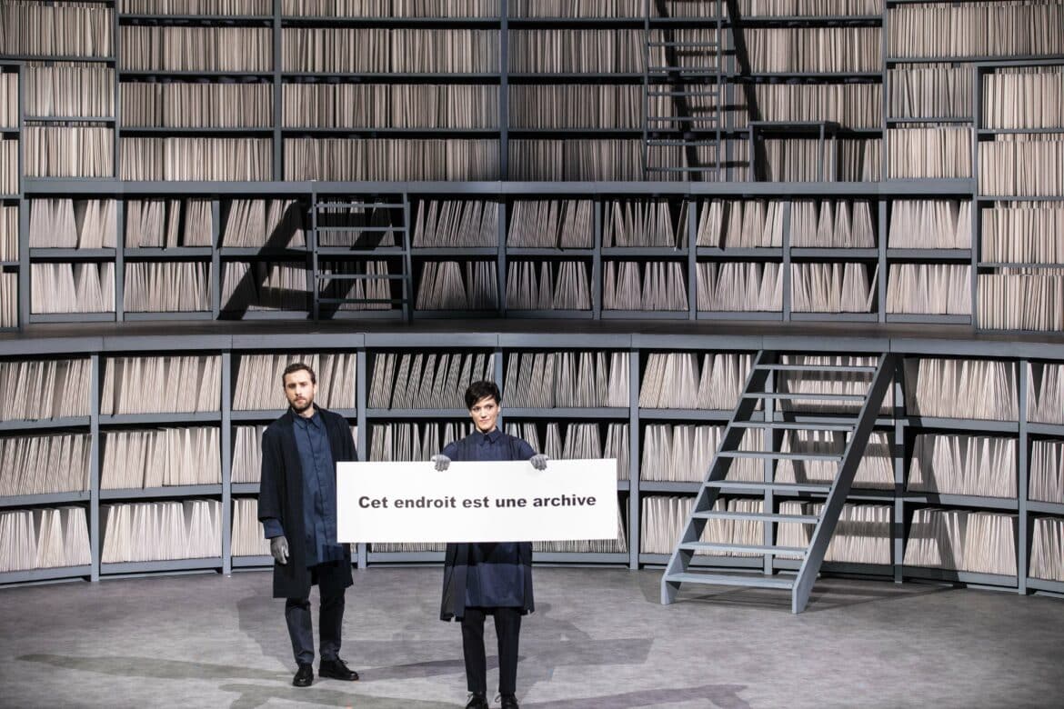 La réussite du pari fou de la mise en scène tient aussi à l’incroyable performance des deux archivistes qui nous relatent les passions tristes de Tristan et d’Isolde : Sofia Dias et Vítor Roriz sont sur le plateau d’un bout à l’autre du spectacle, manipulant sans aucun temps de pause des centaines de cartons Plume qu’il s’agit d’extirper des rayonnages dans un ordre rigoureusement précis. À de nombreux moments, le geste répétitif de brandir les panneaux puis de les laisser couler silencieusement à terre prend des allures de chorégraphie, d’autant que les danseurs s’efforcent d’exprimer sur leurs visages et dans leurs déplacements des émotions qui les mettent eux aussi en interaction avec la salle, faisant voler en éclats le quatrième mur qui isole habituellement le plateau des spectateurs.
