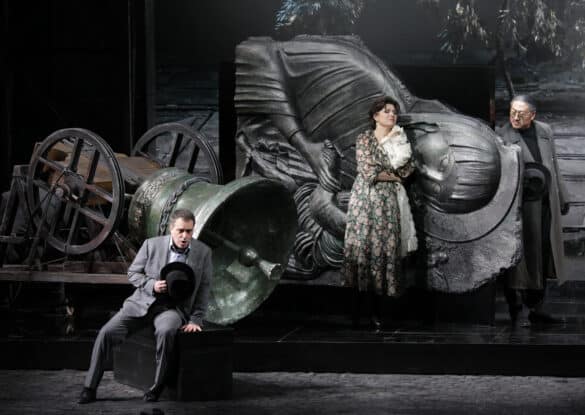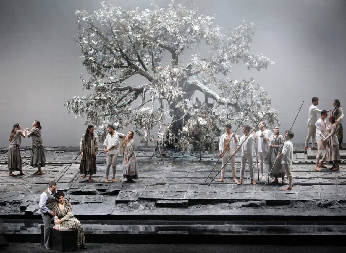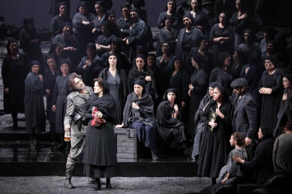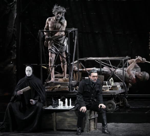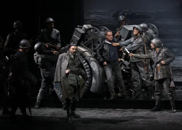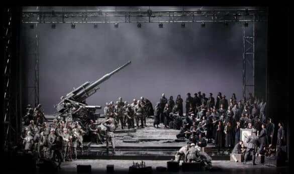 La rivolta del popolo siciliano contro i francesi dominatori scoppiata Lunedì di Pasqua 30 marzo 1282, viene trasposta da Hugo De Ana, che si avvale delle luci di Vinicio Cheli e delle coreografie di Leda Lojodice, in una Sicilia plumbea e grigia durante la seconda guerra mondiale. La chiave di lettura offerta dal regista argentino, che movimenta la scena con una carrellata metallica di cannoni, carri armati, macchine da guerra, scoppi e spari (che potevano benissimo essere evitati per non far trasalire gli spettatori e non disturbare la sacralità della musica!), intende, a moi avviso, sottolineare l’anima stanca, inquieta, malinconica di un popolo oppresso, vestito sempre di nero, su cui incombe inesorabilmente il pensiero ossessivo della morte. Quest’ultima si materializza sulla scena a partire dalla sinfonia d’apertura mentre gioca a scacchi con il cavaliere (citazione de “Il settimo sigillo” di Bergman del 1957), per ricomparire più volte nel corso dell’opera. Un popolo che sa trasformare, però, all’occorrenza, quella componente di atavica “rassegnazione araba”, quell’umore nero inflittogli nel DNA da secoli di invasioni straniere, in uno sfolgorante istinto di rinascita, uno scatto improvviso, rapido e violento, pieno di coraggio, capace di incendiare gli animi alla rivolta per la libertà e… alla riuscita del Vespro!