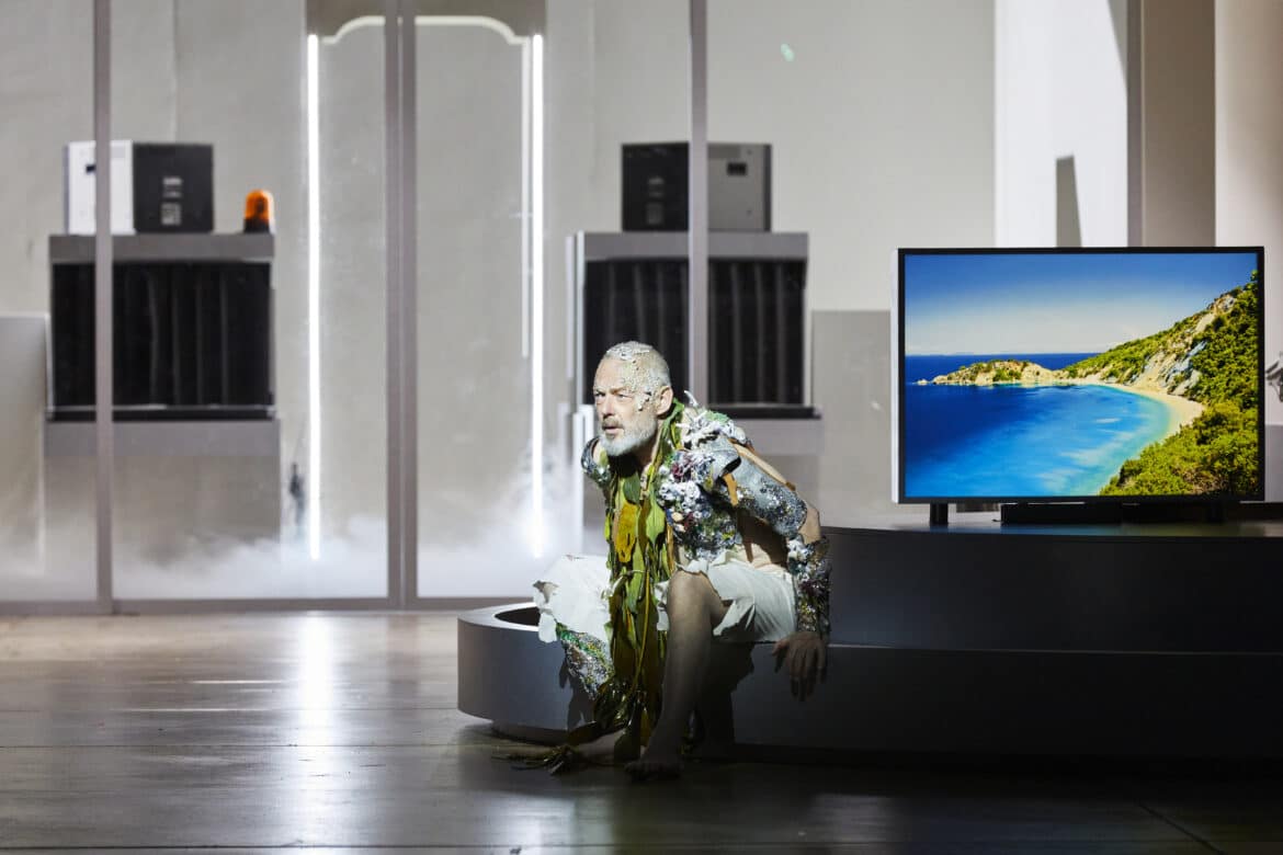 L’environnement aseptisé de l’aéroport est ainsi rempli d’éléments mythologiques, de souvenirs. Il y a de nombreux gags que les metteurs en scène disséminent dans leur lecture, mais aussi des erreurs de dramaturgie, comme le fait de laisser les cadavres des Proci à la vue de tous pendant tout le cinquième acte après une scène dans le pur style « splatter », avec des flots de sang, qui a beaucoup amusé une partie du public. La lecture de FC Bergman a cependant sa propre logique lorsqu’elle met en évidence la relation différente entre les deux couples Mélantho/Eurimaque et Pénélope/Ulysse : le premier animé par les pulsions érotiques de la jeunesse, le second tristement vieilli. Après vingt ans d’absence, Pénélope et Ulysse ont du mal à renouer avec leur intimité, et le happy end final chanté par la musique et les voix est ici plutôt un triste épilogue dans lequel Pénélope, qui a connu la tentation des prétendants, jeunes, en forme, qui se présentent aussi nus pour gagner la réticence de la reine et où l’épreuve de l’arc était chargée de tension érotique, est finalement presque déçue par le retour d’un fiancé cruellement vieilli. Dans l’ensemble, cependant, l’invention du collectif belge manque de cohérence et accumule des éléments de façon désordonnée et anarchique, contrastant souvent fortement avec la musique. Autre élément en leur défaveur : c’est à sa demande que le personnage d’Iro a été éliminé et que certaines scènes ont été coupées.