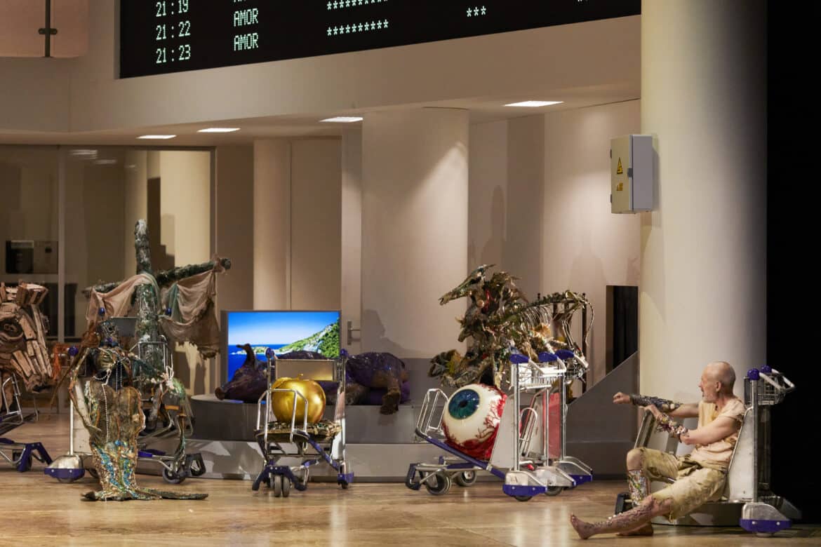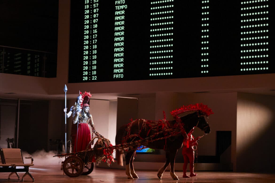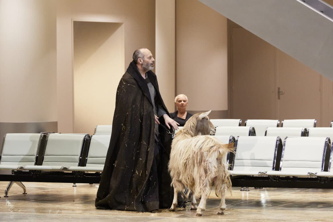 Le collectif anversois a quitté le théâtre classique, attaché au texte, pour se lancer dans le théâtre visuel et expressif, soit un monde d’images plutôt que de dramaturgie proprement dite. Inspirés par le sentiment d’unité propre à une équipe de football (les initiales FC signifient Football Club) associé à l’hommage d’un grand cinéaste (Ingmar Bergman) décédé le jour même où ils cherchaient un nom pour leur groupe, Stef Arts, Marie Vinck, Thomas Verstraeten et Joé Agemans ont d’abord porté leurs spectacles dans des espaces inhabituels. Aujourd’hui au théâtre de Genève, ils célèbrent à leur manière la mythologie dans laquelle s’inscrit l’histoire du Retour d’Ulysse, une mythologie qui s’est pourtant éloignée des hommes. En effet, dans la pièce, les dieux n’apparaissent d’abord pas en personne, mais comme des éléments réagissant à l’environnement : Neptune est un distributeur d’eau qui parle par giclées, Jupiter une boîte de jonction électrique qui émet de la fumée et des étincelles. Ce n’est qu’à la fin qu’ils apparaissent dans les costumes imaginatifs de Mariel Manuel, mais c’est un peu décevant. Nous sommes en fait dans le terminal des arrivées d’un aéroport moderne, avec le grand tableau des vols – avec ici les noms de l’Amour, du Destin, du Temps -, une vue de la plage d’Ithaque, un escalator menant à l’étage supérieur et des rangées de sièges sur lesquels sont affalées trois femmes en noir : Pénélope, Euriclée et Mélanthe, cette dernière dans un séduisant déshabillé de soie connotant immédiatement la sensualité de la jeune fille. Sur le tapis roulant des bagages, Ulysse entre en scène avec ses souvenirs de voyage : l’œil de Polyphème, la pomme d’or de Pâris, la tête du cheval de Troie… Près de l’escalator, nous voyons une botte de foin et une chèvre que nous découvrirons être le fidèle compagnon d’Eumeus – rappelons-nous qu’un mouton avait été la vedette du spectacle de FC Bergman à Avignon il y a deux ans, Le Chant du mouton. Un autre animal sur scène est présent sur scène : le cheval qui ramène Télémaque à Ithaque dans un char coloré. Trop de bêtes…