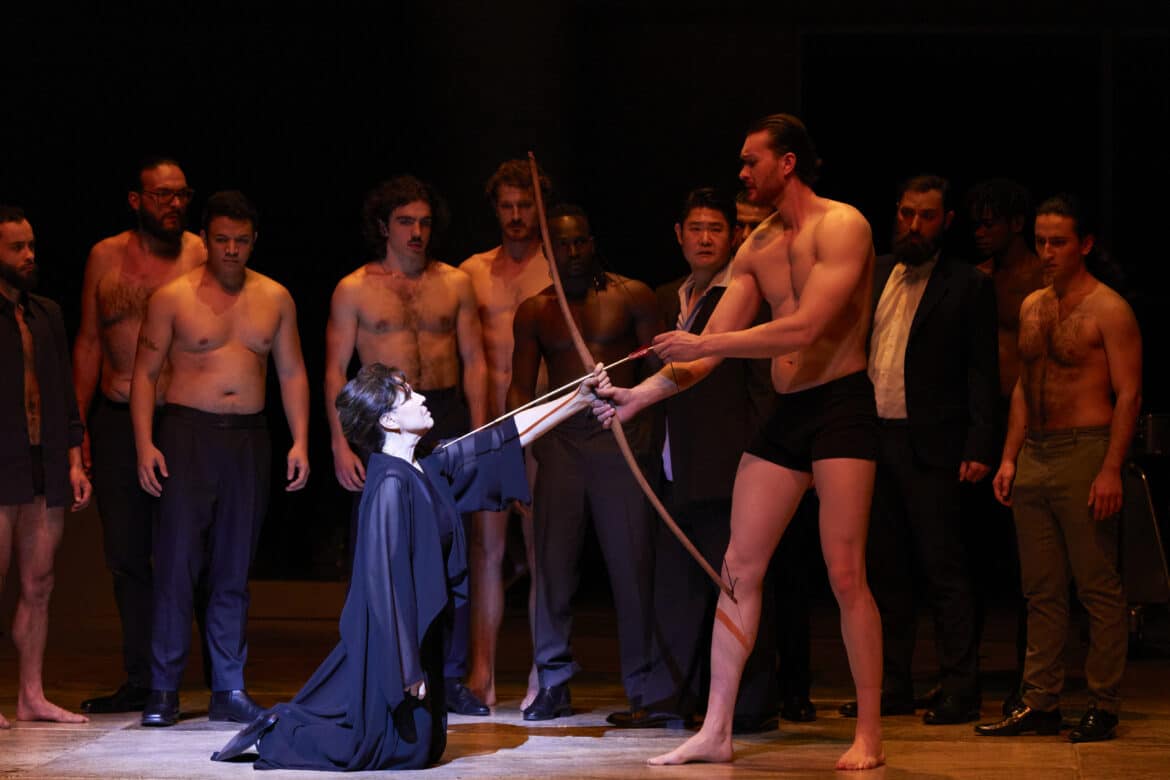 La direction/reconstruction de Fabio Biondi se caractérise par une « sobriété aux mille couleurs », comme Christopher Park intitule son entretien avec le maestro dans le programme. Ainsi, le declamato des acteurs-chanteurs est préservé, c’est-à-dire la pureté et le sens du texte, l’hédonisme vocal des chanteurs étant encore assez éloigné des préoccupations de l’époque. Cela ne signifie pas pour autant qu’on ne puisse pas faire ressortir les trésors cachés dans la partition, et c’est le cas ici, avec des équilibres sonores parfaits, des mélanges instrumentaux raffinés, des couleurs suggérées par les instruments anciens, et les brillantes interventions solistes du Maestro au violon. Le tapis sonore soigné du continuo est confié à la harpe, au clavecin, au théorbe, à la viole de gambe, au luth et à l’orgue de chambre, tandis que les autres cordes, les bois et les cuivres interviennent dans les moments dramatiques, comme dans la scène prolongée du massacre des Proci. Mais c’est souvent le silence qui souligne les points de tension de l’histoire, comme la douloureuse reconnaissance d’Ulysse «Troppo incredula! Ostinata troppo!» Les sonorités choisies par Biondi tiennent compte du théâtre dans lequel l’opéra est joué : avec ses 1 500 places et son architecture, le Grand Théâtre n’est pas une salle vénitienne du XVIIe siècle avec ses cinq ou six instrumentistes ! Des flûtes à bec sont donc ajoutées aux refrains, les dieux et les personnages allégoriques sont accompagnés par quatre trombones baroques, les cordes sont doublées.