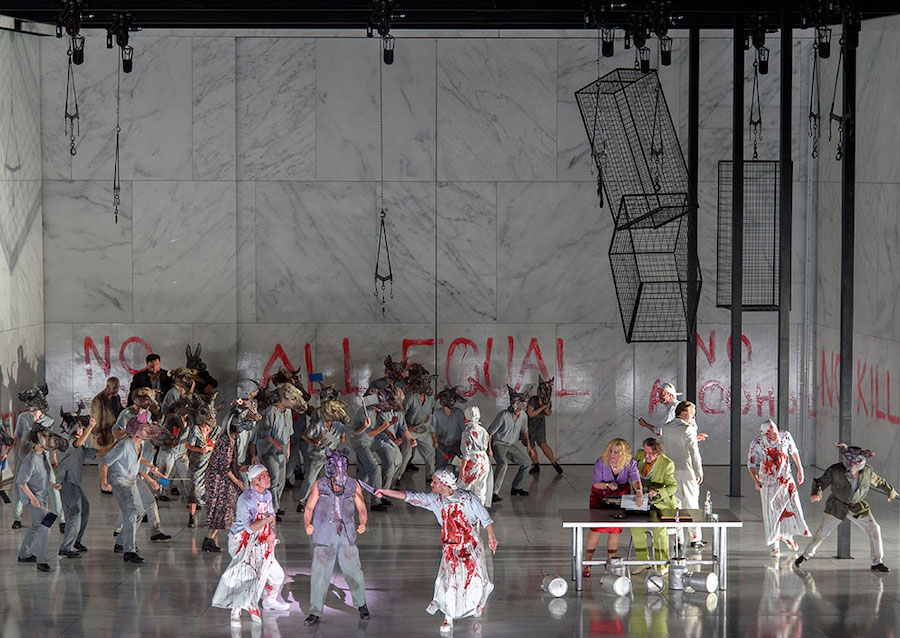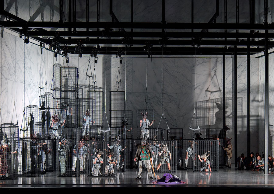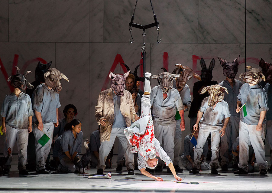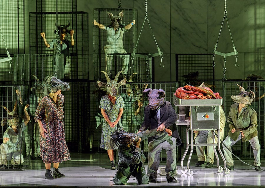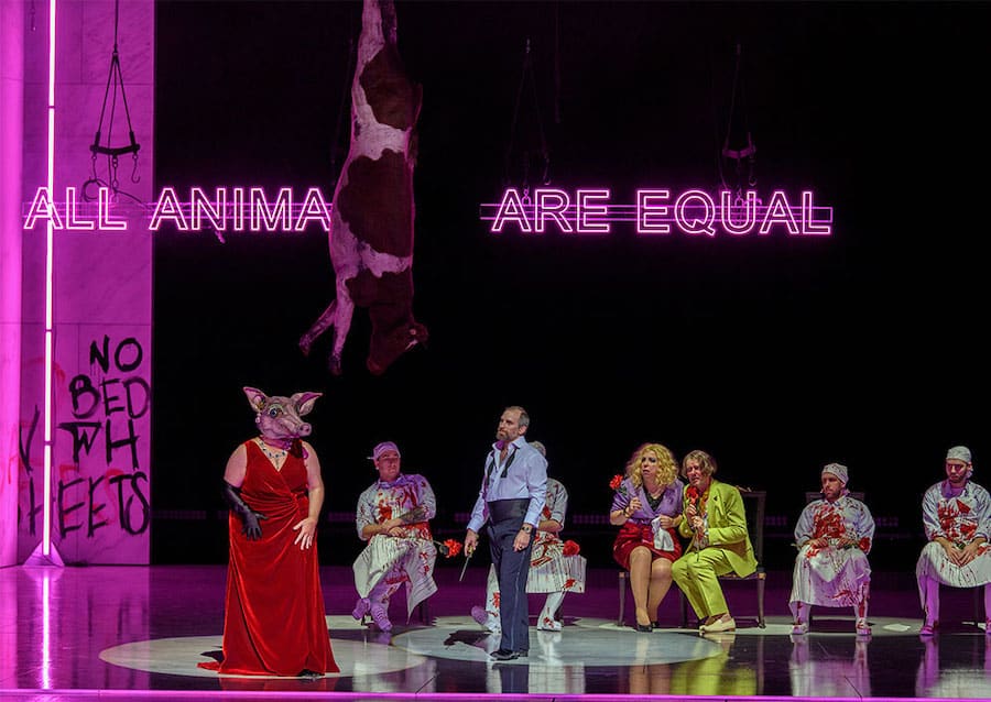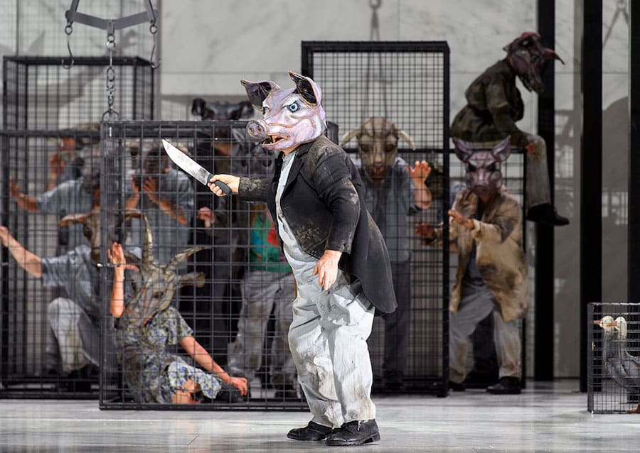 L’ensemble du spectacle est dynamisé par la mise en scène de Michieletto, s’accordant parfaitement au ton de l’histoire : le décor intemporel est celui d’un abattoir aseptique aux murs de marbre blanc et aux néons froids – Paolo Fantin dit s’être inspiré de celui de Rome – avec des cages en fer enfermant » notre nourriture « . Michieletto se souvient peut-être ici de sa mise en scène de Il dissoluto punito, le Don Giovanni Tenorio de Ramón Carnicer i Batlle situé dans une boucherie, présentée à La Corogne en 2006. Ici, les personnages portent des masques d’animaux qu’ils abandonnent peu à peu pour devenir de plus en plus des hommes, avec tous leurs vices. Même les commandements écrits à la peinture rouge sur les murs sont progressivement modifiés à la peinture noire. Les cages disparaissent pour laisser place, dans le finale, à des canapés en velours et des lustres en cristal, lorsque la transformation des animaux en humains tant détestés est enfin achevée.