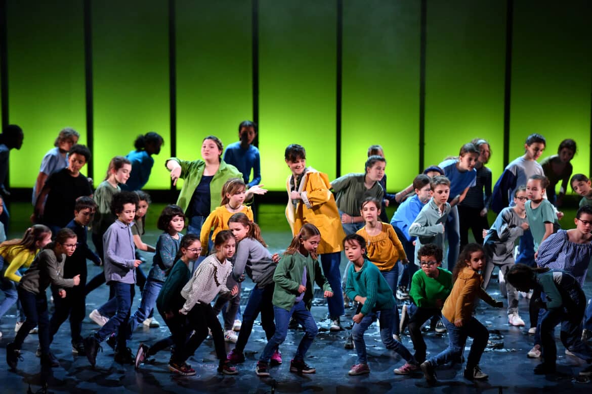 Sur le plateau, une rotation de 100 jeunes ! L’émotion qui s’en dégage est revigorante à plus d’un titre. L’énergie des enfants du Petit Opéra, celle du Jeune Opéra, d’où sont issus les rôles solistes et les activistes lycéens, sont bien palpables. Second atout, le spectacle est chansigné par deux artistes qui doublent souvent les héroïnes, Juliette et sa mère Alice, créant une bulle poétique autour de leurs silhouettes, tout en faisant accéder des centaines de malentendants au spectacle. A cet égard, soulignons les qualités vocales des deux héroïnes fortement sollicitées : Hermione Delaygue OU Lilou Tuzet en rotation (Juliette), Léna Chevrot Roche OU Romane Minodier (Alice). Hors du Prélude, l’écriture orchestrale tisse quelques motifs contrepointés sous le chant ou bien scande des danses actuelles avec peps sous la direction de Jérôme Pillement. Si la balance avec les voix d’adolescents n’est pas toujours heureuse, notamment par l’écriture des cuivres qui surplombe les ensembles vocaux, l’alternance du parlé-chanté aurait probablement mieux servi l’œuvre. Par exemple, les interjections polyglottes des manifestants, de l’espagnol au thaïlandais.