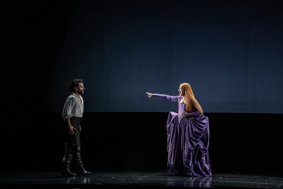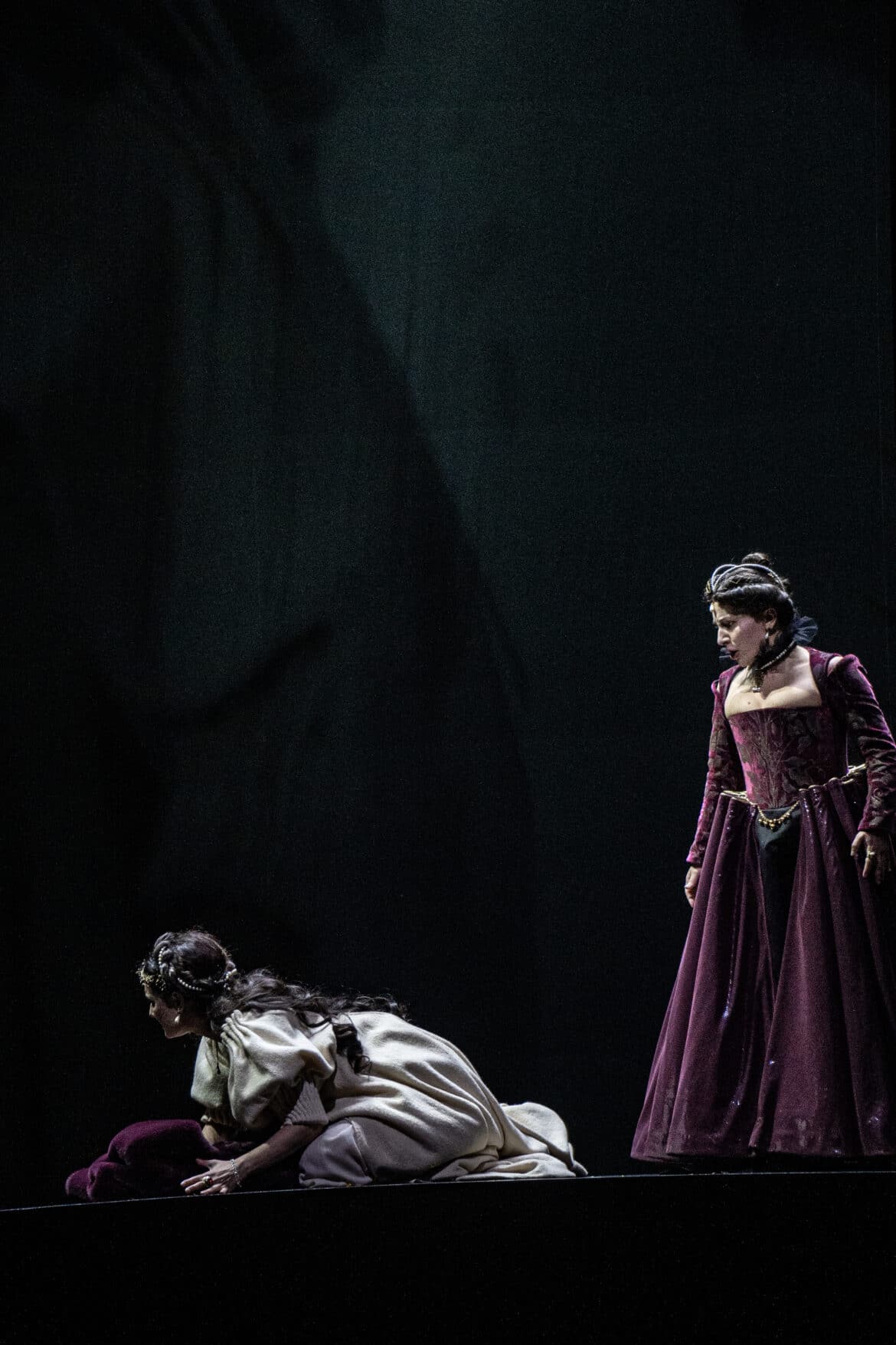 On pouvait craindre que les moyens de Lenneke Ruiten (déjà applaudie en ces lieux dans Les Huguenots) ne soient un peu frêles pour le rôle de Marie Stuart. Il n’en est rien : l’émission manque peut-être un peu d’ampleur pour le redoutable « Nella pace del mesto riposo » ; mais le reste du rôle est parfaitement assumé, et une technique aguerrie et une belle maîtrise du legato lui permettent de délivrer un fort beau « Oh nube! Che lieve per l’aria ti aggiri » et surtout une superbe prière empreinte d’émotion lors du second soir. Salome Jicia entame plusieurs fois les premières phrases du « A dolce guidami » d’Anna Bolena, qu’elle chante tout comme une comptine, tel un fantôme venu consoler sa fille des souffrances qu’elle endure et qui ne lui rappellent que trop les siennes passées. Lors de la seconde soirée, l’occasion lui est enfin donnée de la chanter dans son intégralité, et elle y déploie un timbre dense, richement coloré, émaillant la ligne de chant de belles nuances conférant à cette cantilène toute l’émotion requise. À Francesca Sassu échoit l’honneur de faire revivre l’héroïne éponyme d’Elisabetta al castello di Kenilworth, à qui elle prête une voix chaleureuse, de qualité égale sur tout l’ambitus. Pour Bastarda II, c’est Myrtò Papatanasiu qui incarne Elisabeth : elle se montre à ce point convaincante dans ce répertoire (maîtrise technique, respect du style, sensibilité) qu’on se demande pourquoi les théâtres ne songent pas plus souvent à l’engager dans des rôles belcantistes. Faisant preuve d’une endurance incroyable (elle enchaîne coup sur coup le « Vivi, ingrato » de Roberto Devereux, la mort d’Elisabetta puis celle de Maria Stuarda – qui, dans ce spectacle, échoit curieusement à Elisabeth – avec une endurance étonnante… et un sens de l’émotion tragique qui lui font recueillir une spectaculaire ovation. Espérons que cette expérience parfaitement réussie suscitera de nouveaux engagements de Myrtò Papatanasiu dans le répertoire belcantiste.