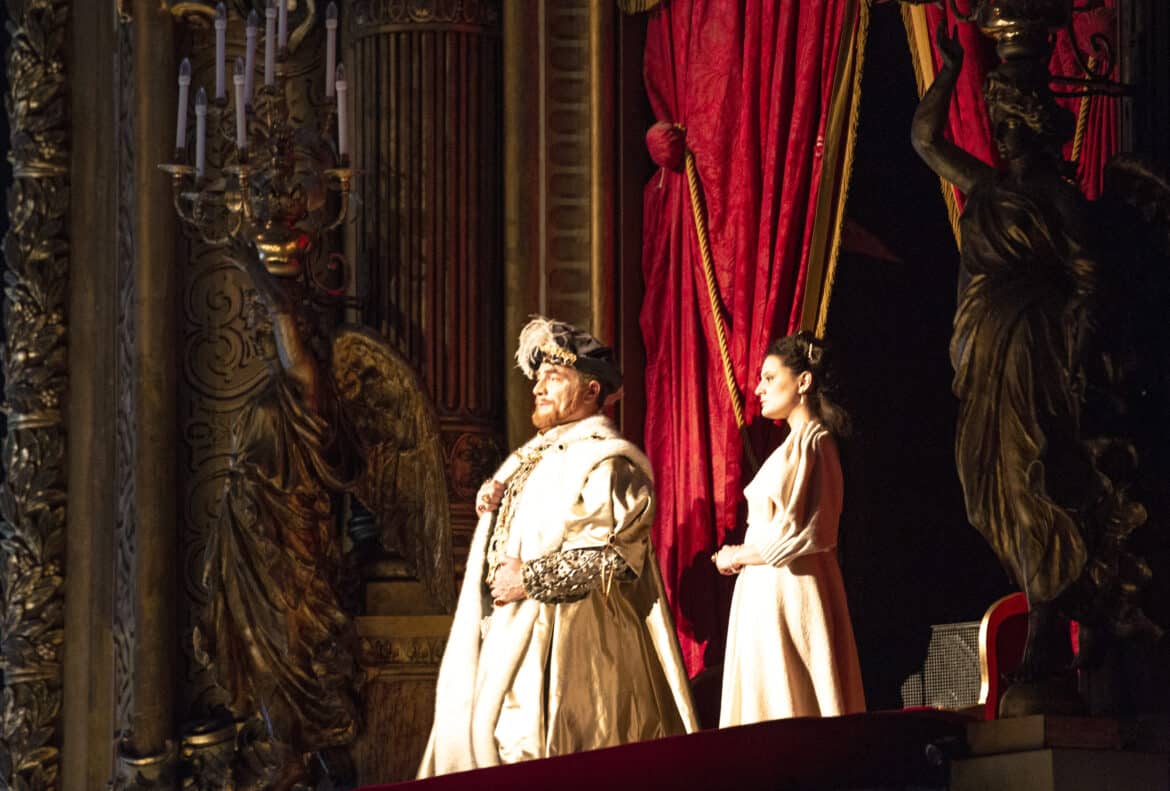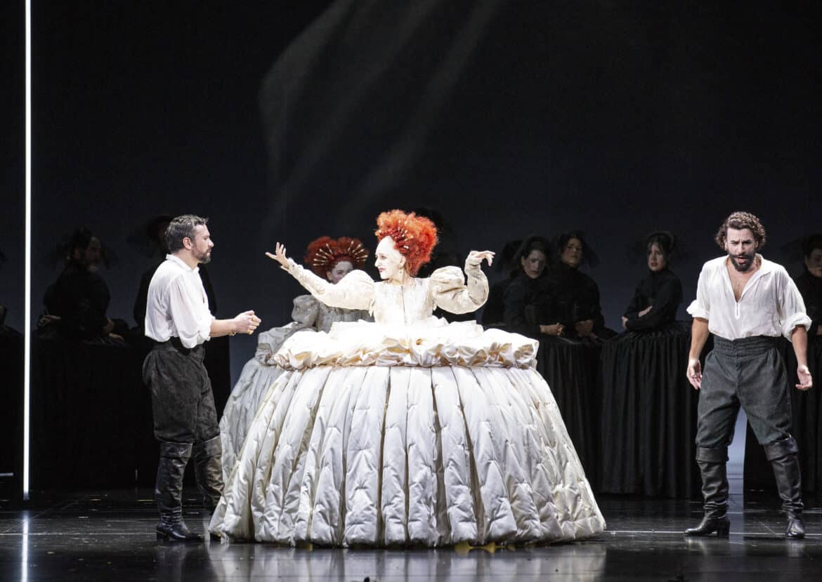 Aucune faiblesse dans la distribution. Saluons en premier lieu Nehir Hasret, formidable de justesse et de sensibilité (mais aussi d’endurance !) dans son incarnation d’Elisabetta enfant. Dans les seconds rôles, Luca Tittoto (Enrico) et Valentina Mastrangelo (Amy Robsart) font valoir de beaux timbres expressifs portés par un style idoine. Le choix du contreténor David Hansen pour incarner Smeton peut être contesté sur le plan philologique. Le chanteur australien s’acquitte malgré tout fort habilement de sa tâche, et se révèle par ailleurs un excellent comédien : tout comme Gavan Ring (un Cecil « ténor », aux interventions bien maîtrisées), il est presque constamment présent sur le plateau et déroule avec son confrère le fil conducteur de l’intrigue, s’adressant tantôt à la reine elle-même, tantôt au public, largement pris à partie par rapport au drame auquel il assiste. Bruno Taddia chante assez peu, mais il remporte un succès mérité dans l’air de Nottingham (Roberto Devereux), chanté avec conviction et phrasé avec goût. Raffaella Lupinacci prête à Giovanna Seymour et Sara sa voix puissante à l’aigu particulièrement facile. Les deux ténors font entendre des voix très différentes et très complémentaires, Enea Scala jouant plus sur la virilité et l’énergie (avec un médium particulièrement large et des aigus arrogants), Sergey Romanovsky privilégiant la tendresse et le registre élégiaque (avec un « O tu che m’ivolasti » – Roberto Devereux – extrêmement touchant).
