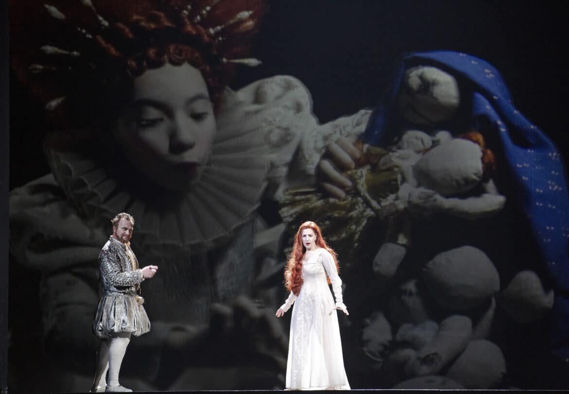 Soyons honnête : on s’attendait à une sorte de concert plus ou moins mis en espace, qui aurait essentiellement permis de combler notre frustration de ne quasi jamais entendre en France le Donizetti serio – à l’exception bien sûr de la sempiternelle Lucia, et de quelques rares versions de concert ou récitals offerts de temps en temps par le T.C.E. Eh bien nous avions tout faux ! C’est au total un spectacle d’une très grande richesse qu’a proposé la Monnaie de Bruxelles, la création d’une véritable œuvre originale, construite à partir d’extraits d’ouvrages préexistants (la fameuse trilogie Tudor de Donizetti – Anna Bolena, Maria Stuarda, Roberto Devereux – à laquelle vient s’ajouter la rarissime Elisabetta al castello di Kenilworth), entrecoupés de scènes parlées. Le résultat ? Une vaste fresque (pas loin de 6 heures de spectacle en deux soirées !) recomposant le destin d’Elisabeth Ire, de son enfance tourmentée (sa mère Anne Boleyn est exécutée alors qu’elle a à peine trois ans) à ses dernières années, marquées par son idylle avec Robert Devereux, et sa mort – qui ouvrit la voie à la dynastie des Stuart. On n’ose imaginer le nombre d’heures de travail qu’il aura fallu au metteur en scène Olivier Fredj, concepteur du spectacle et auteur, avec Yann Apperry, des textes parlés, ainsi qu’au chef Francesco Lanzillotta – qui non seulement dirige mais a également réalisé certains arrangements et composé certaines pages – pour parachever cette création. Le résultat est à la hauteur des efforts déployés : l’ensemble constitue une tragédie dense, palpitante, faisant alterner, comme chez Shakespeare – ou l’opéra baroque – humour, drame et tragédie, tenant en haleine un public dont l’attention ne se relâche jamais, et qui explose littéralement d’enthousiasme au rideau final ! Le spectacle est beau, émouvant : dans une scénographie très épurée (où les vidéos, sobres, tiennent le plus souvent lieu de décor), les chanteurs-acteurs, avec le soutien de quelques accessoires, des belles lumières de Urs Schönebaum et des très beaux costumes de Petra Rheinhardt), campent avec conviction les protagonistes des divers drames traversés par la fille d’Henri VIII, auxquels les partitions de Donizetti apportent un contrepoint musical saisissant. Bravo à Francesco Lanzillotta pour sa direction précise et amoureuse. Si, ici ou là (le « Va ! La morte sul capo » de Roberto Devereux, par exemple) les forces de la Monnaie – au demeurant excellentes ! – auraient mérité d’être fouettées un peu plus vigoureusement, la direction du chef italien ne connaît aucun temps mort et maintient constamment la tension dramatique, tout en étant particulièrement attentif à la teneur poétique des cantilènes parfois dignes de Bellini que le compositeur bergamasque réserve à ses héroïnes.